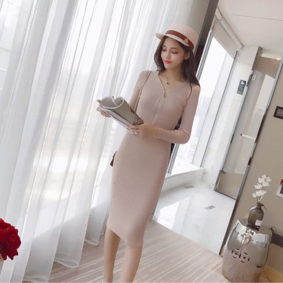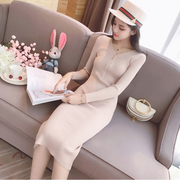 针织连衣裙修身2025新款女装秋冬装V领显瘦中长款毛衣打底裙包臀