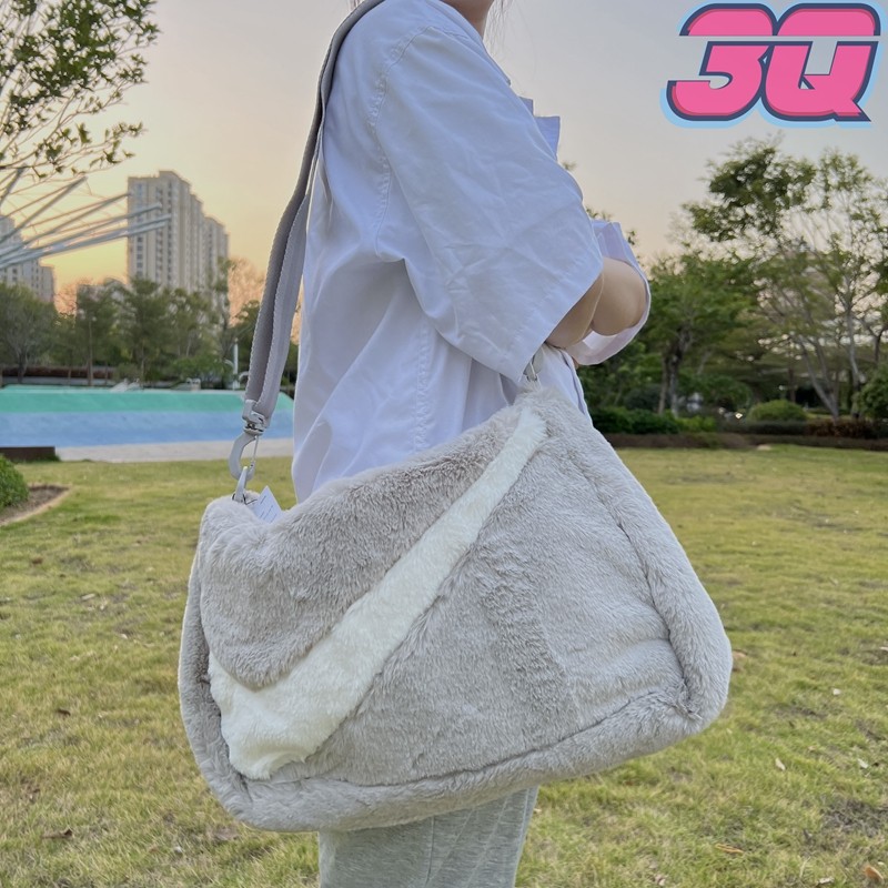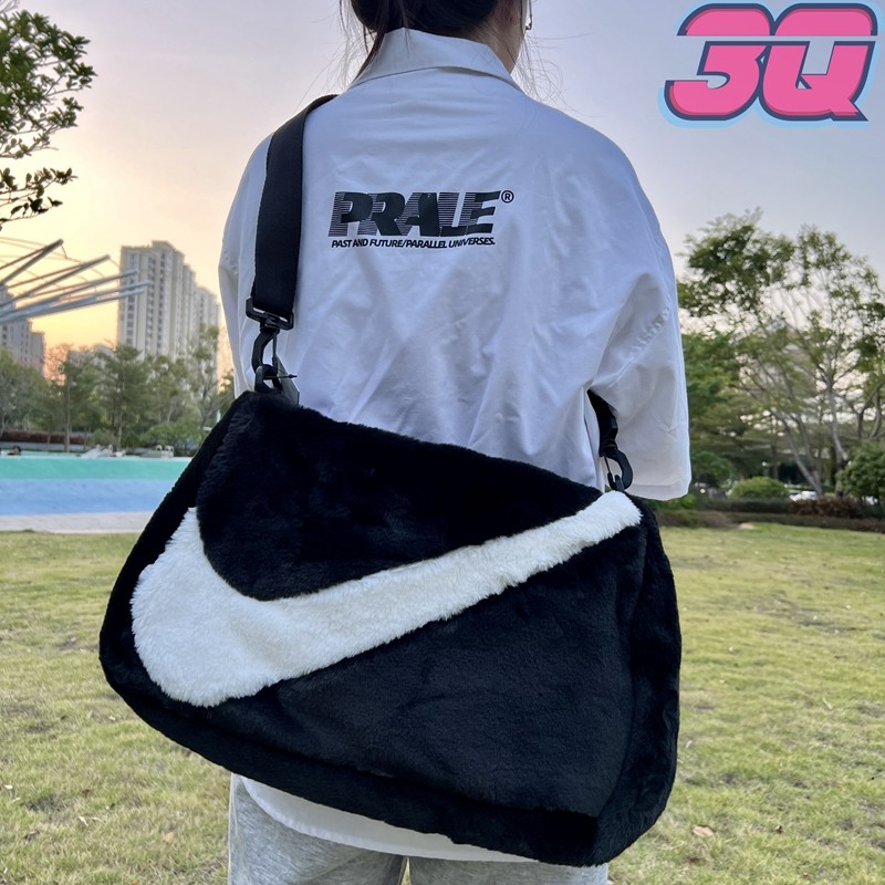 NIKE耐克毛绒大勾LOGO托特包斜挎包女子运动单肩包手提拎包DQ5804