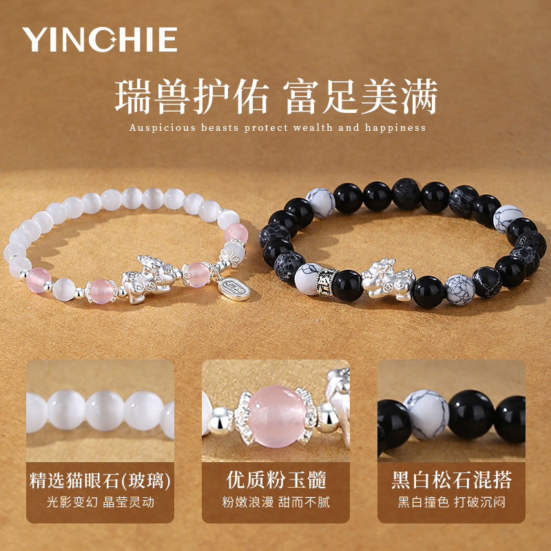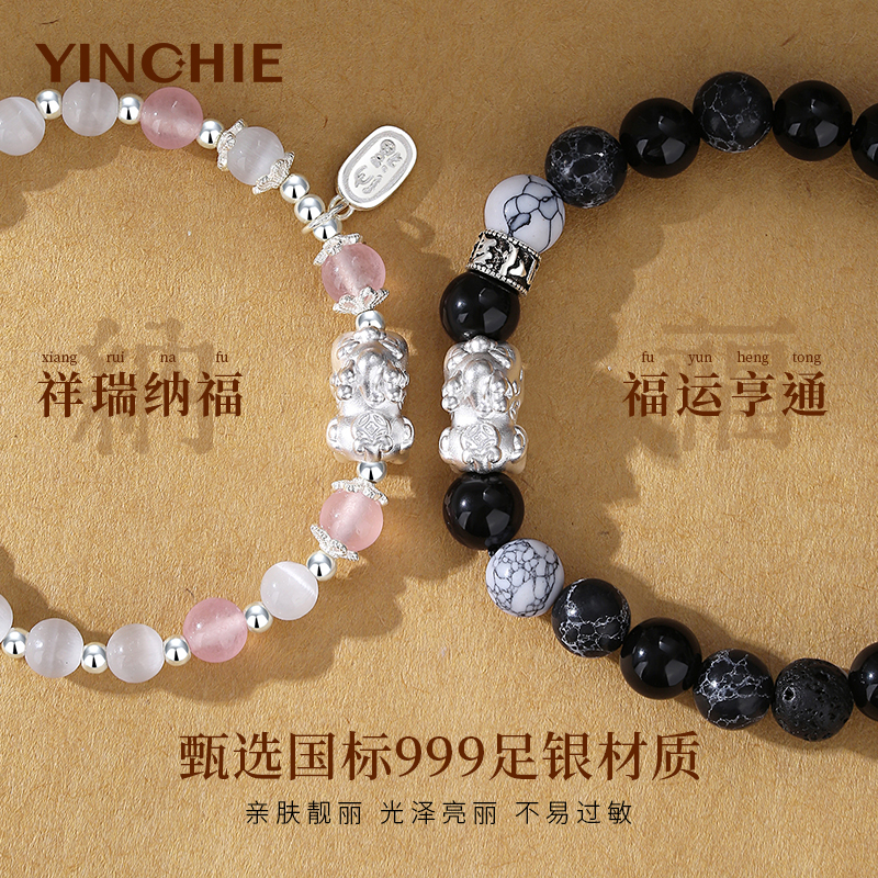 999足银貔貅情侣手链黑曜石转运珠手串女款生日礼物刻字招财