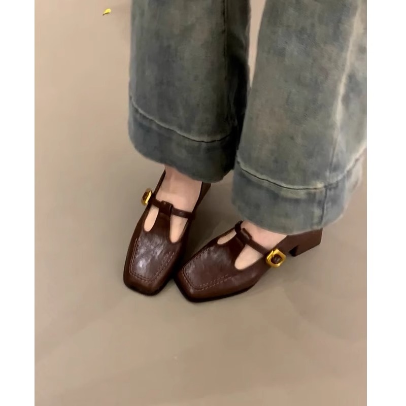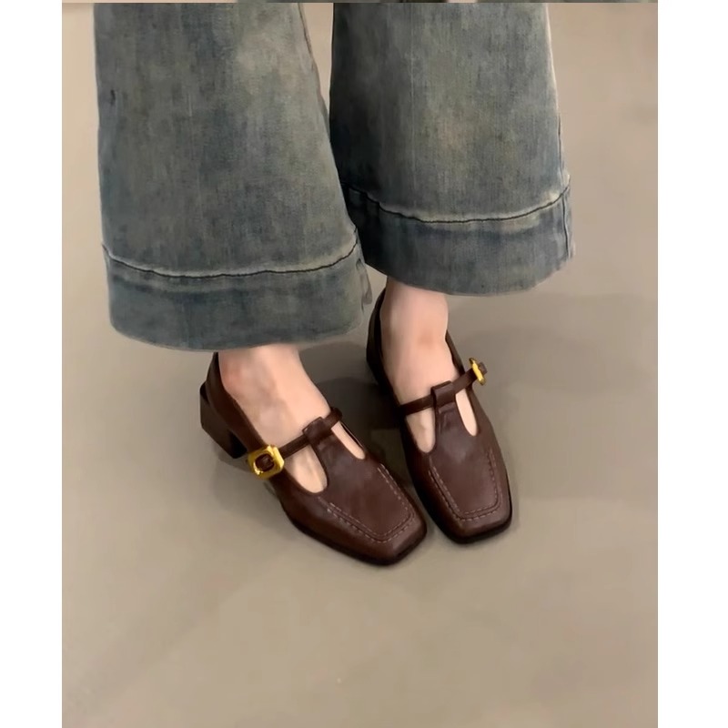 羊皮版~复古玛丽珍鞋女法式方头一字带单鞋气质粗跟乐福鞋小皮鞋
