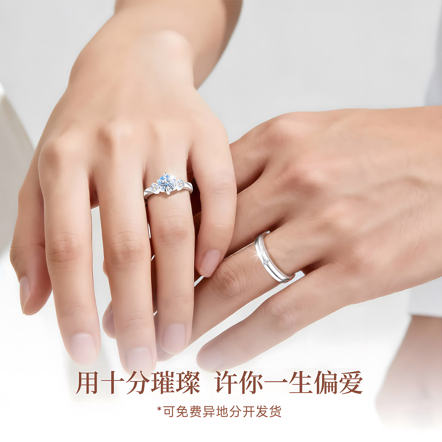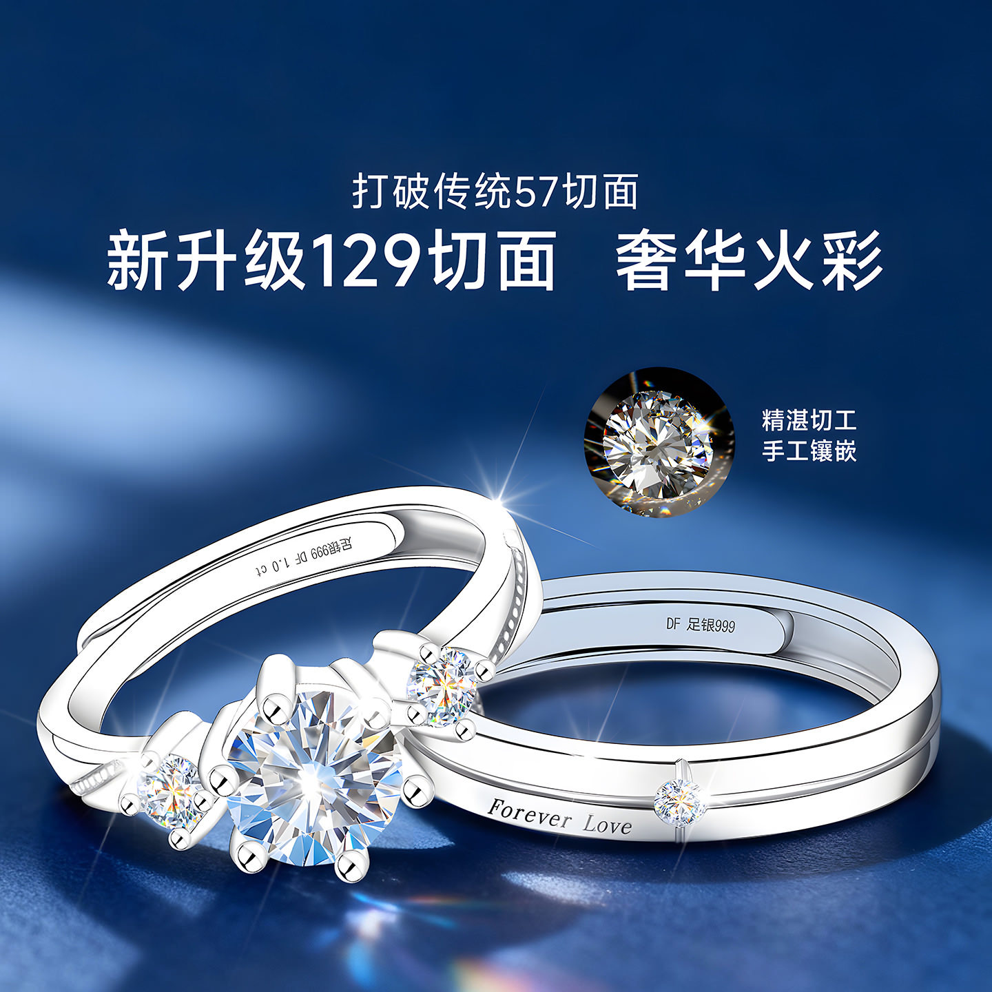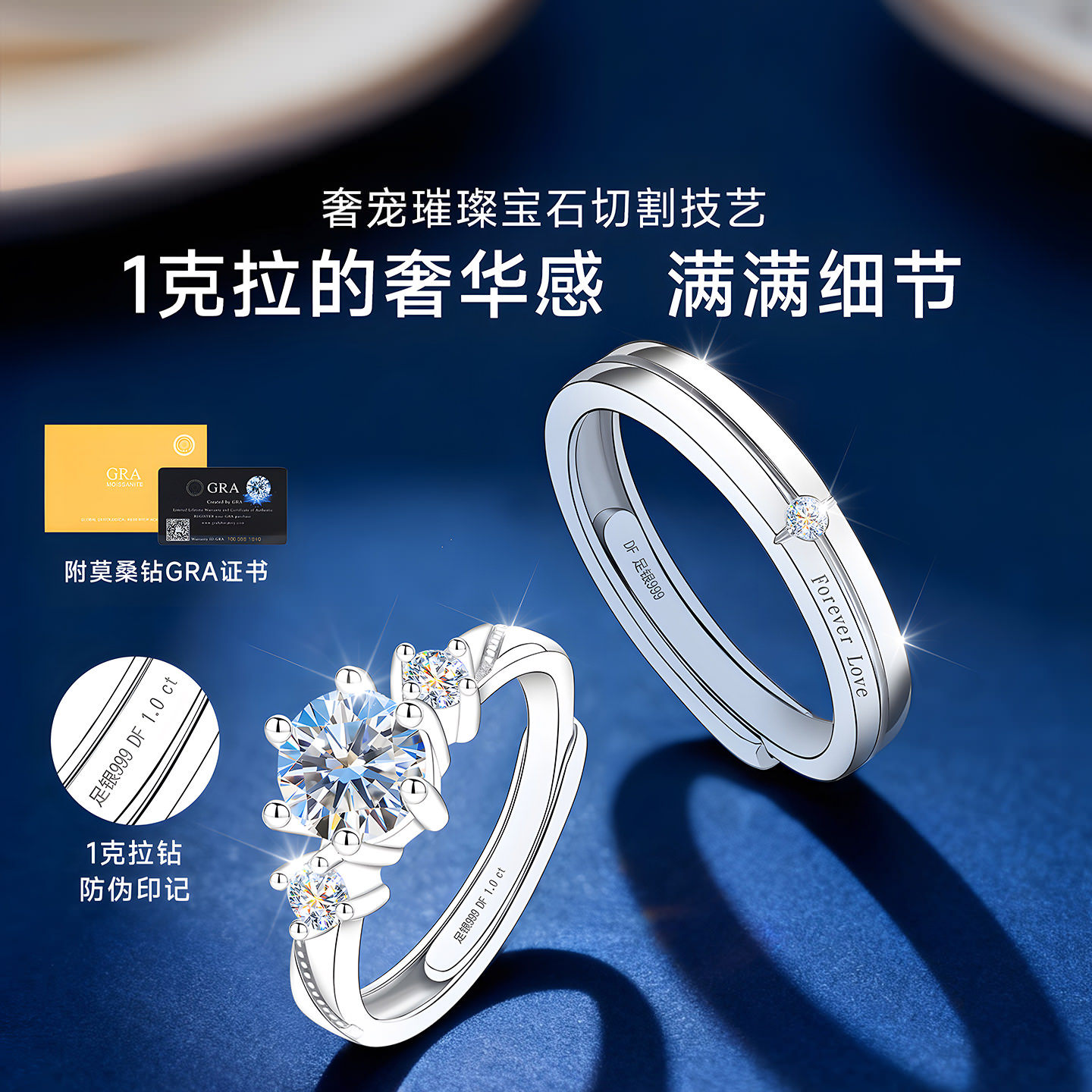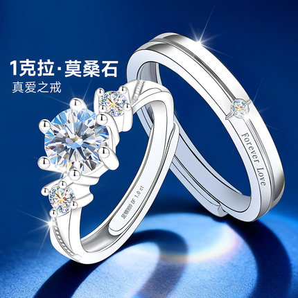 银戒指女男999纯银情侣对戒D色莫桑石钻戒一对情侣款求婚结婚专用