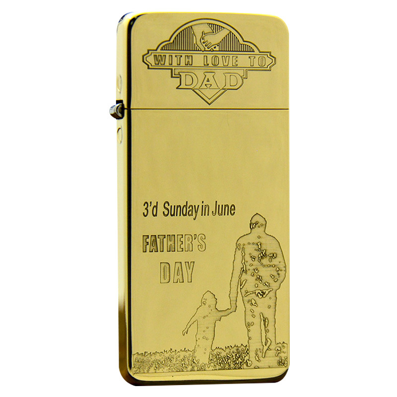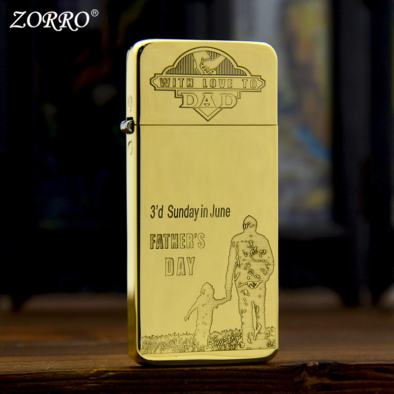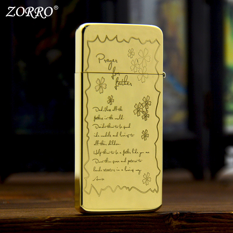 ZORRO佐罗正品纯黄铜金色超薄窄款砂轮煤油打火机雕刻图父爱如山A
