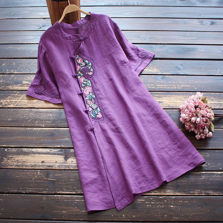 夏季新款复古立领盘扣纯棉连衣裙女中国民族风刺绣气质款修身显廋