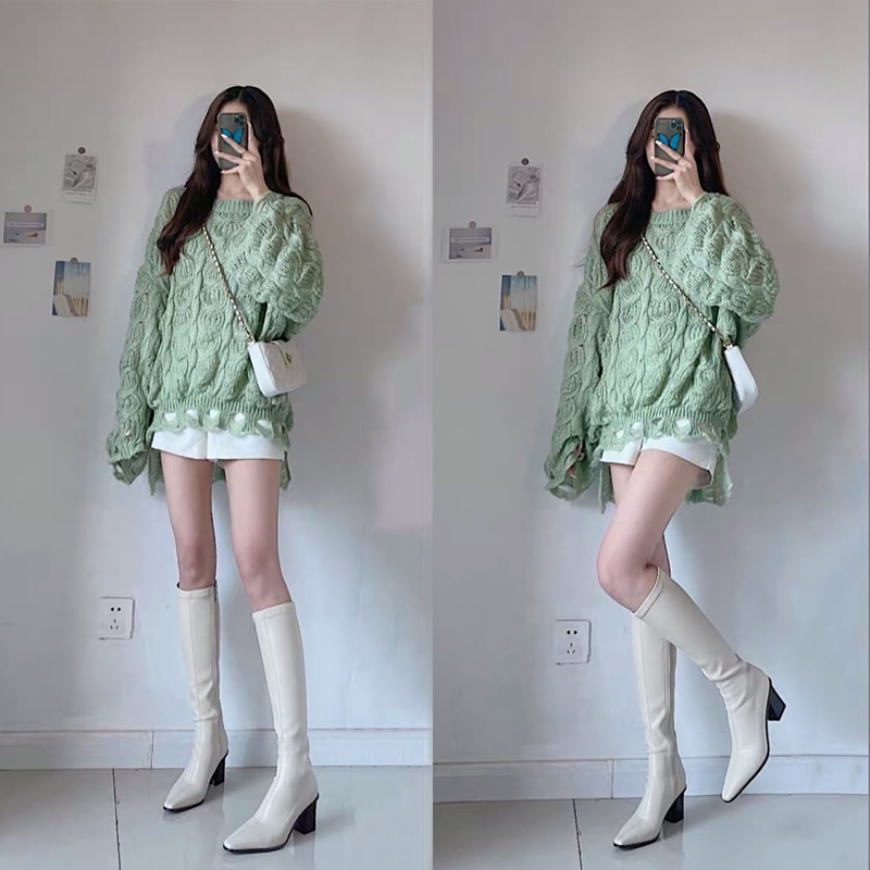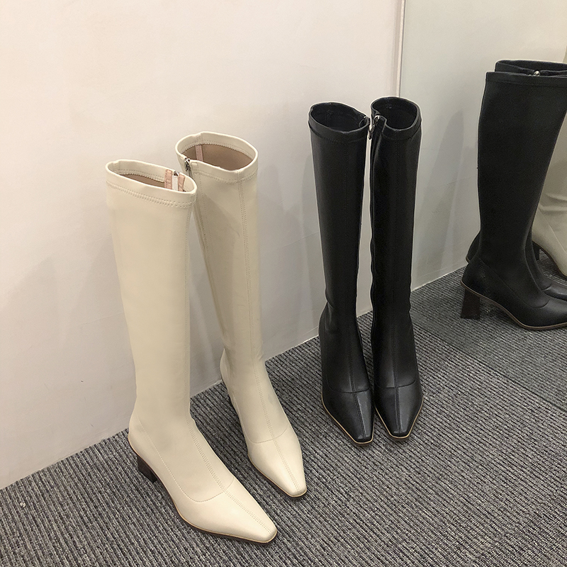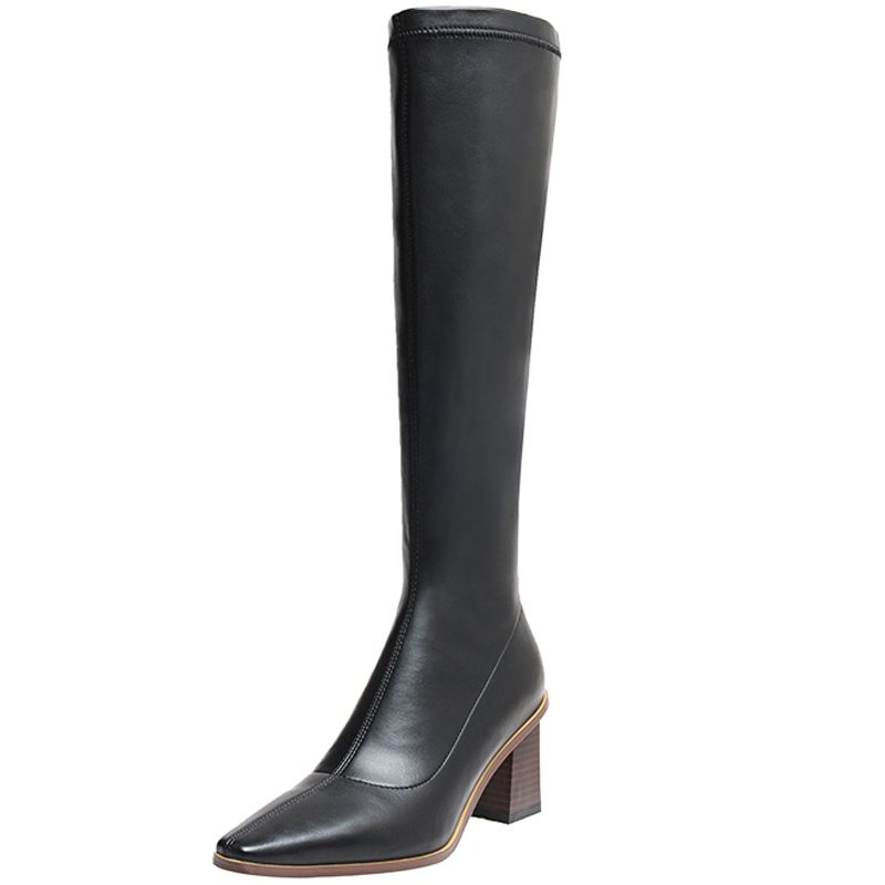 Hunnz长筒靴女秋冬新款弹力瘦瘦靴真皮显瘦包腿粗跟高跟高筒靴