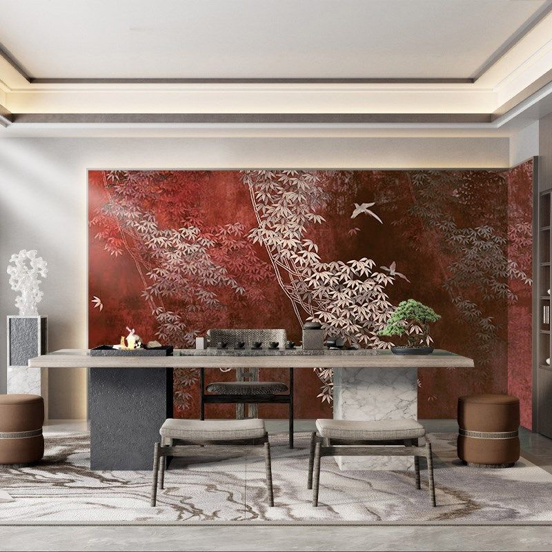 新手绘鸟红色枫叶壁画客厅电视背景墙壁纸卧室沙发无缝壁布