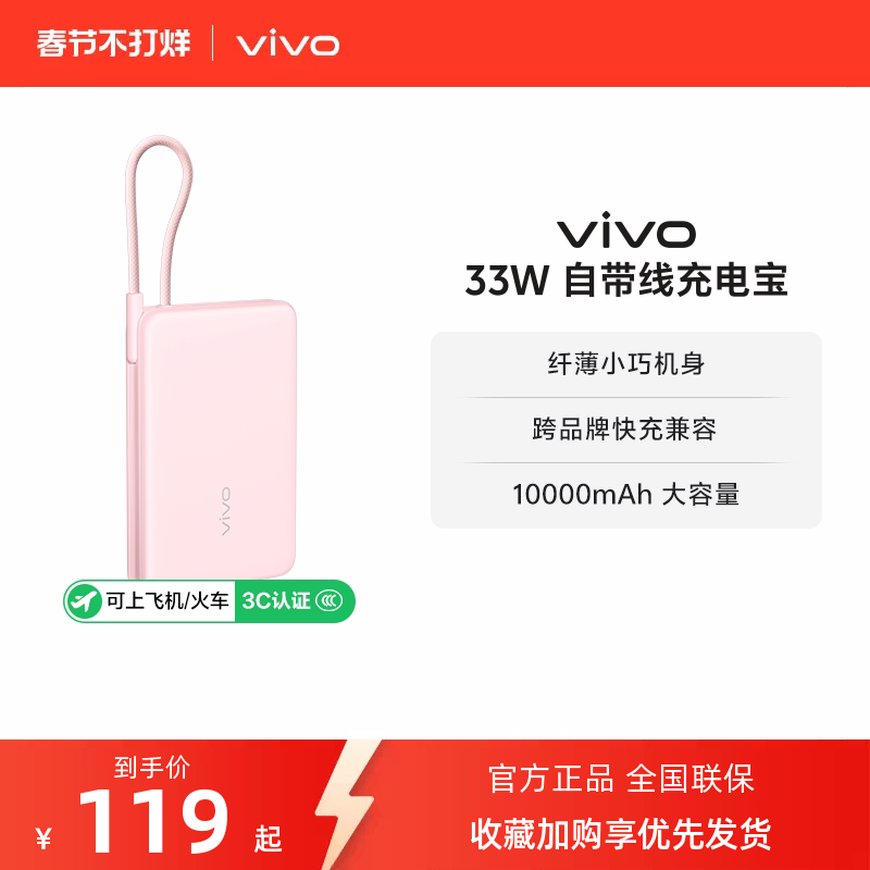 【 3C认证】vivo自带线充电宝10000毫安33W可上飞机大容量快充便携学生新品户外出行