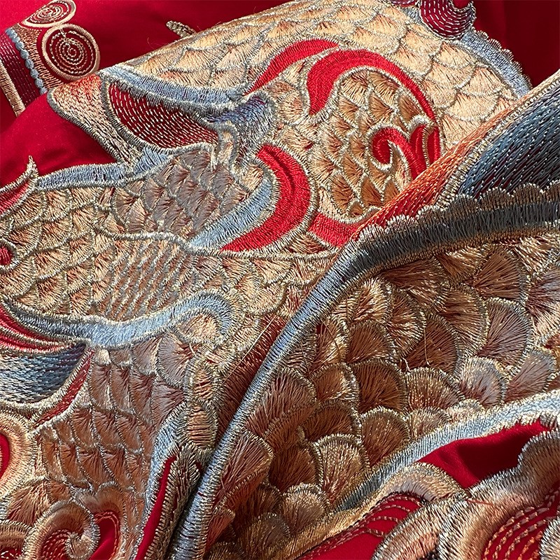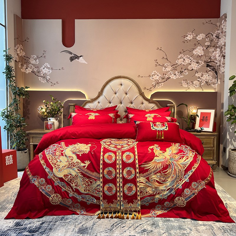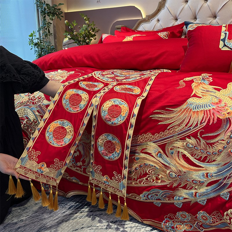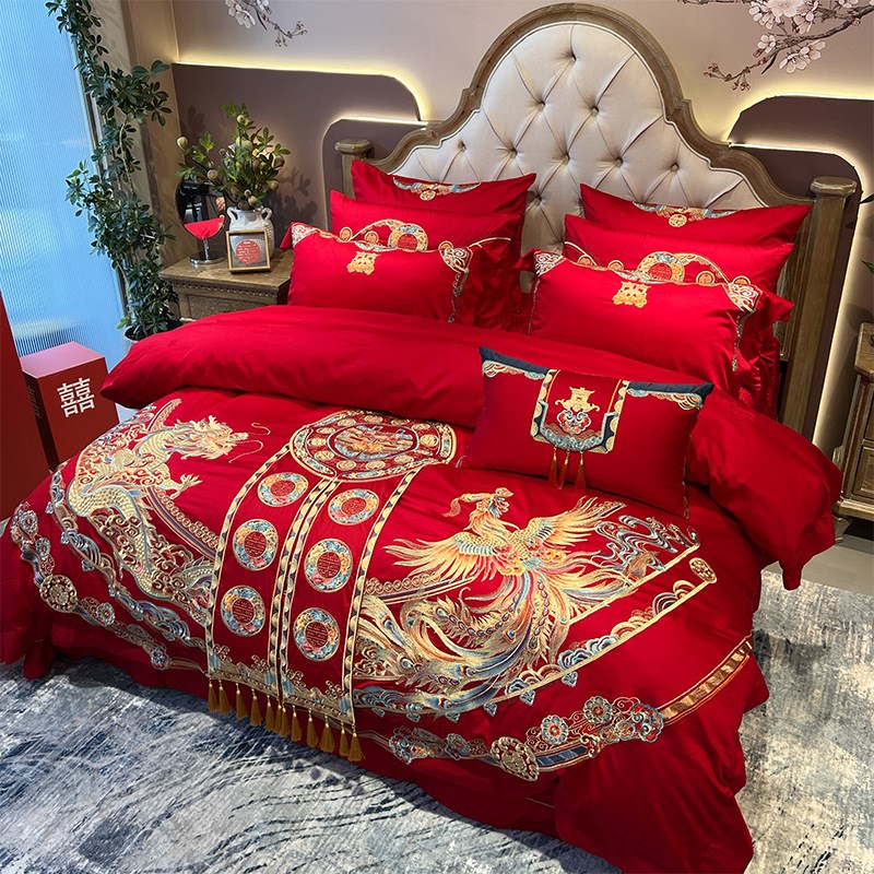 结婚季丨中式婚庆100支贡缎提花重工金线刺绣四件套 多件套正红色