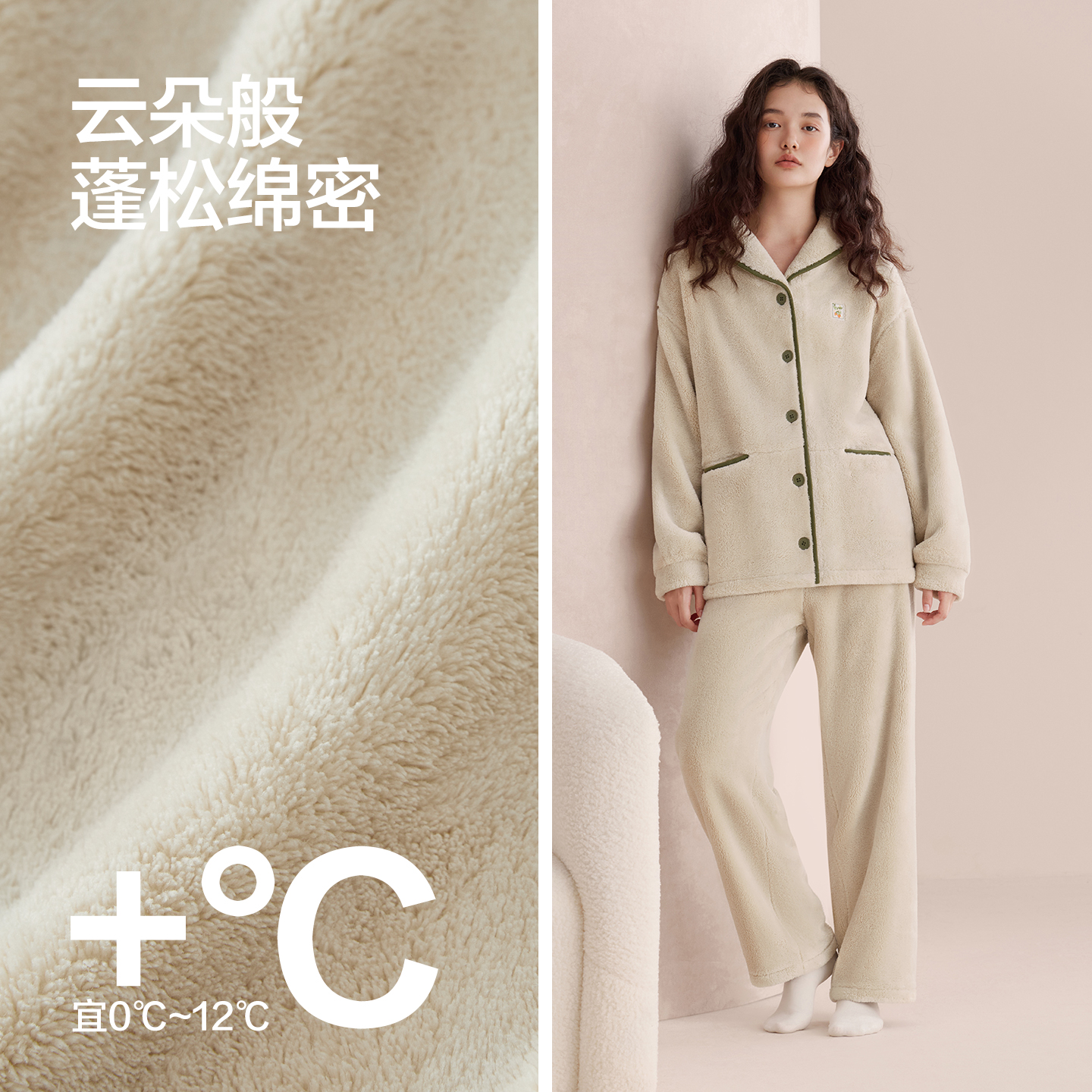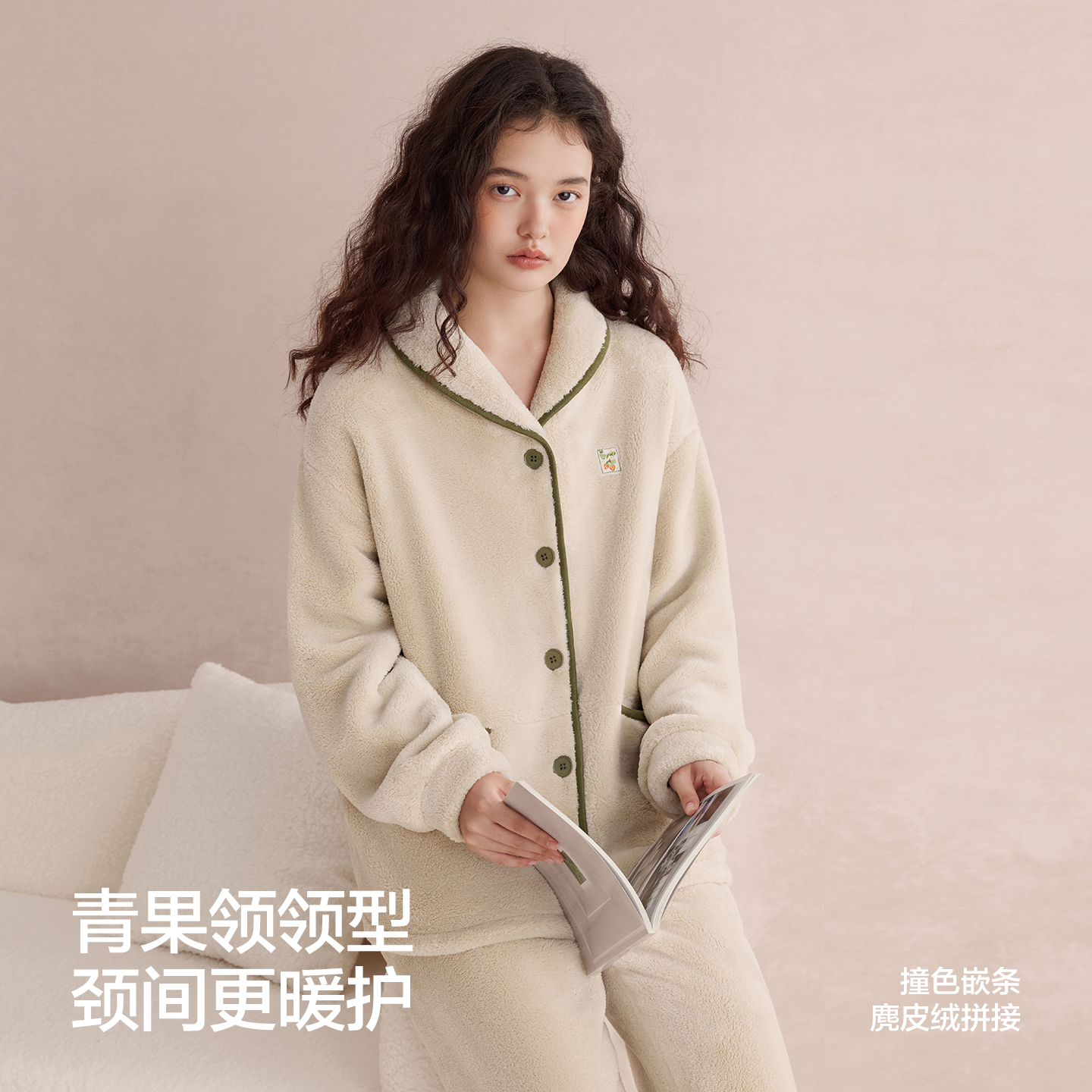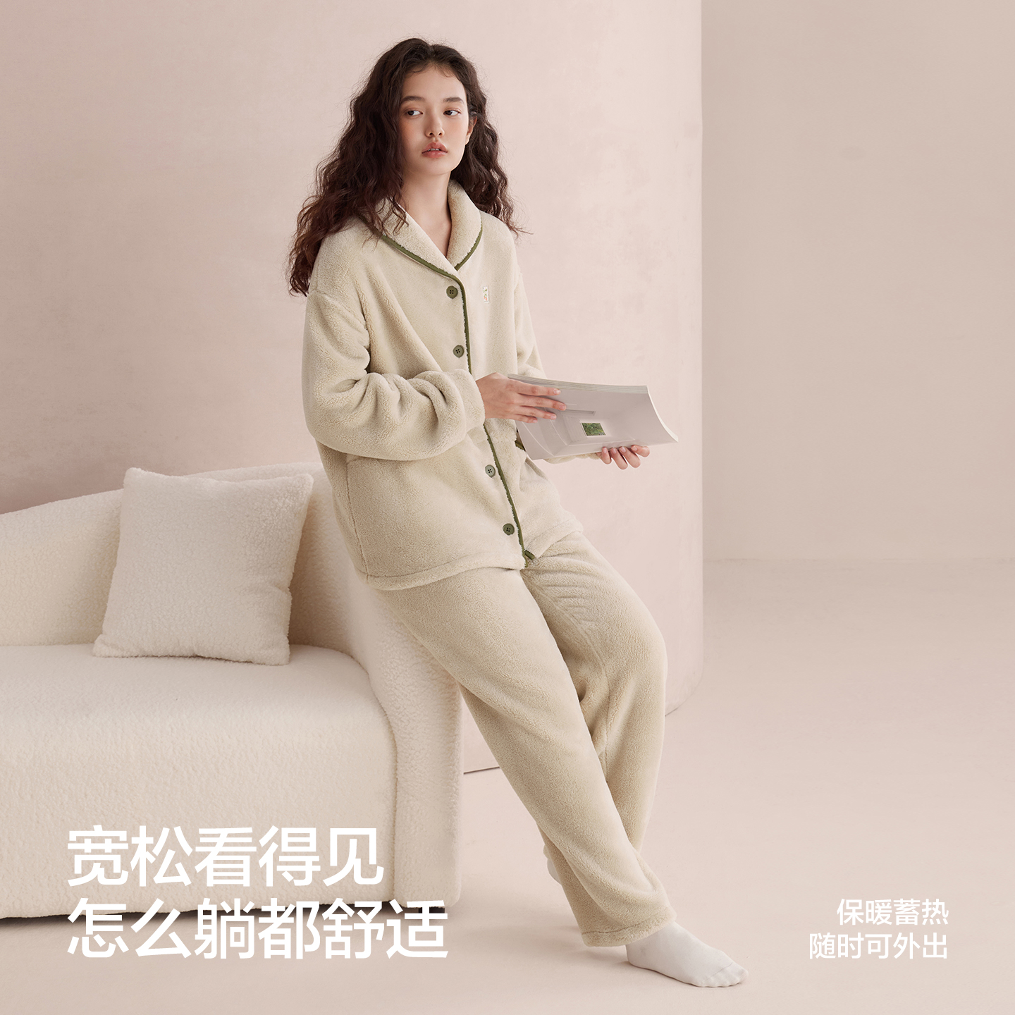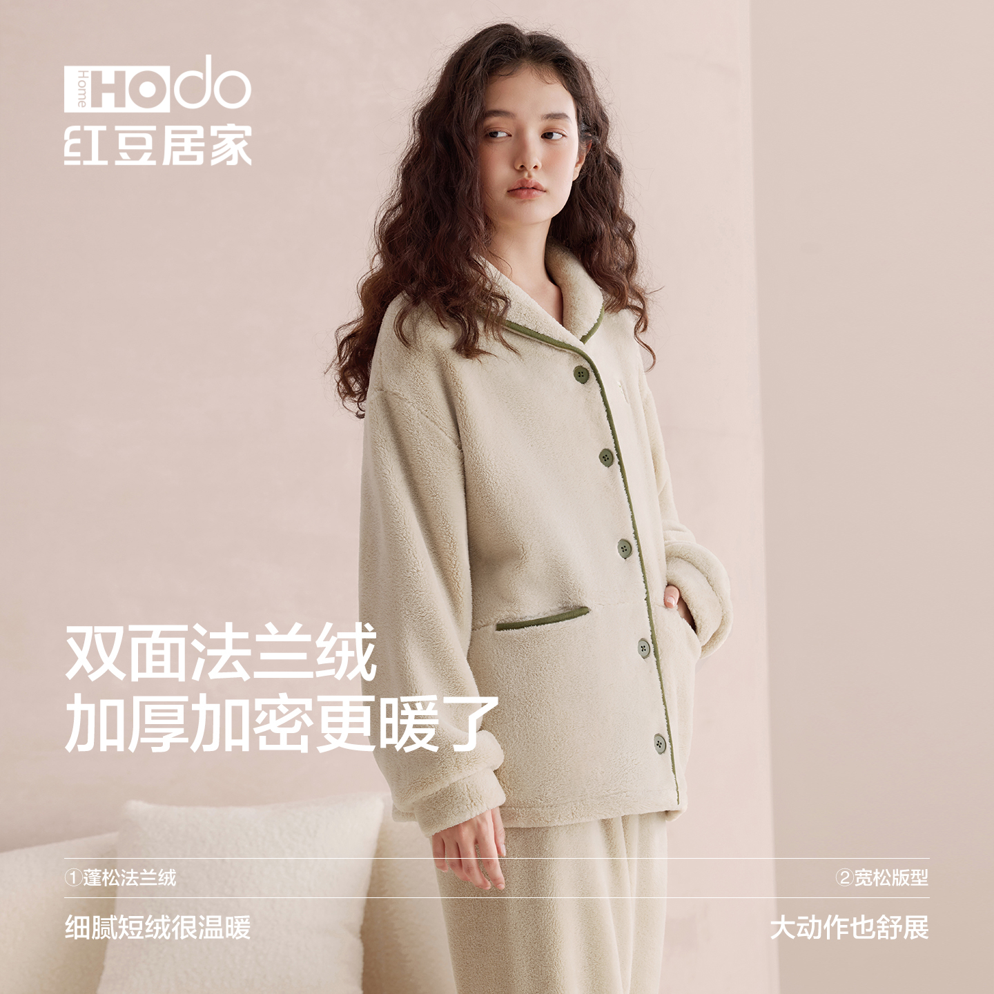 红豆居家法兰绒加厚睡衣女士冬季宽松珊瑚绒抗静电保暖家居服套装
