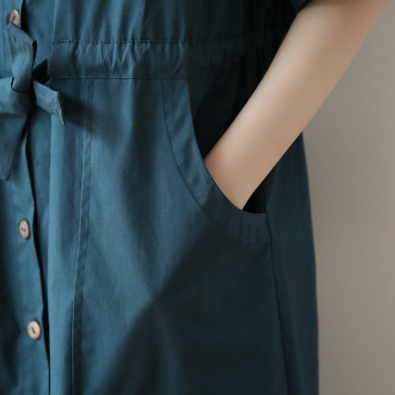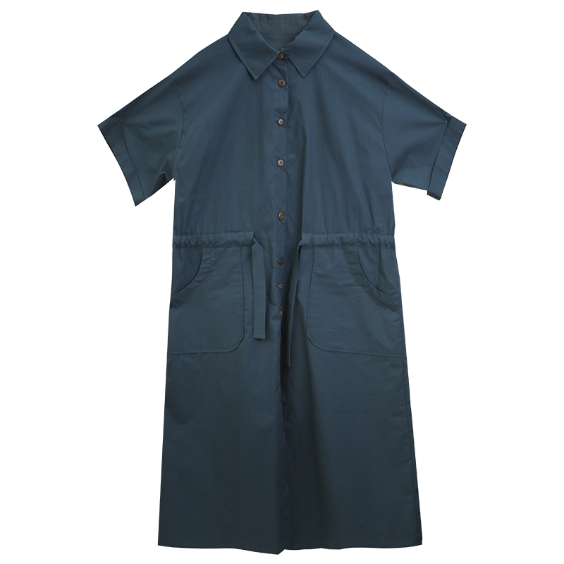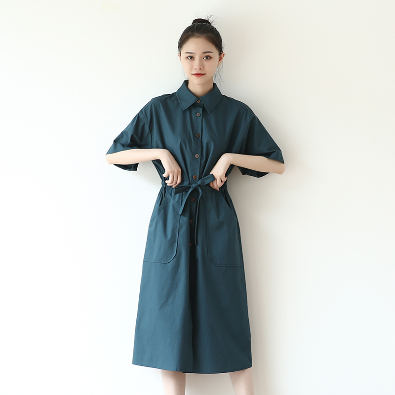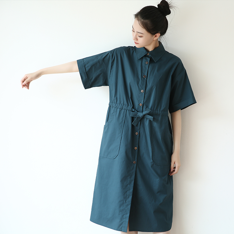SUIN2024夏新复古文艺休闲宽松大码显瘦棉衬衫式中长短袖连衣裙女