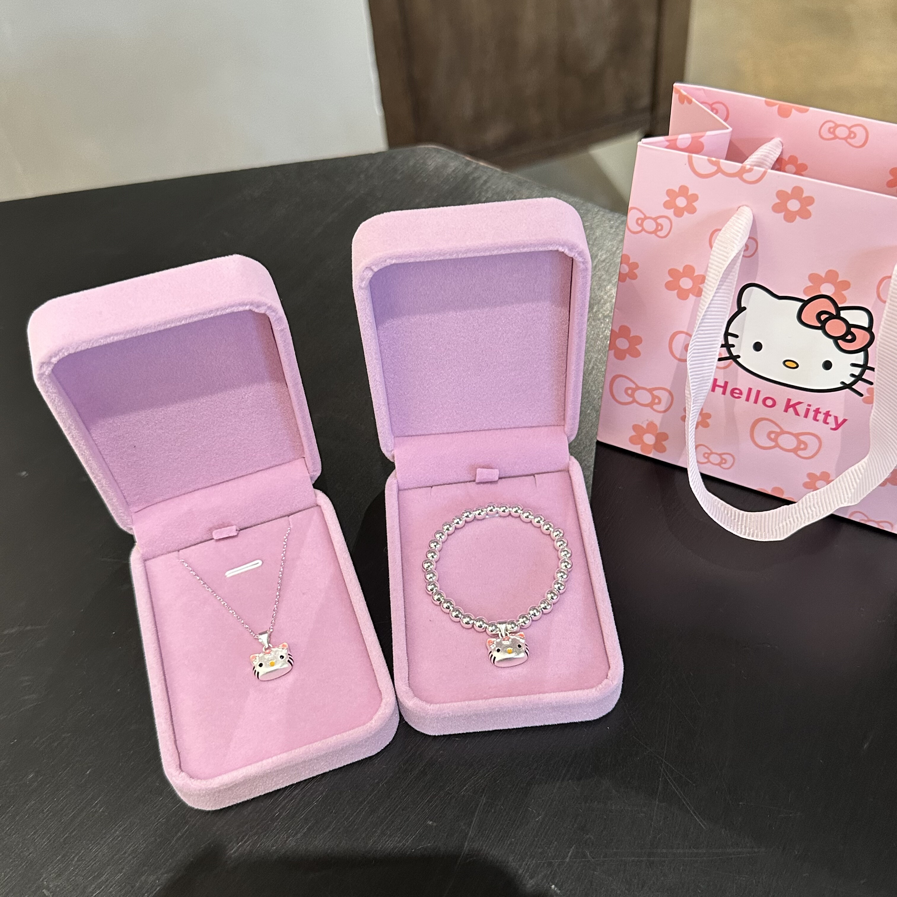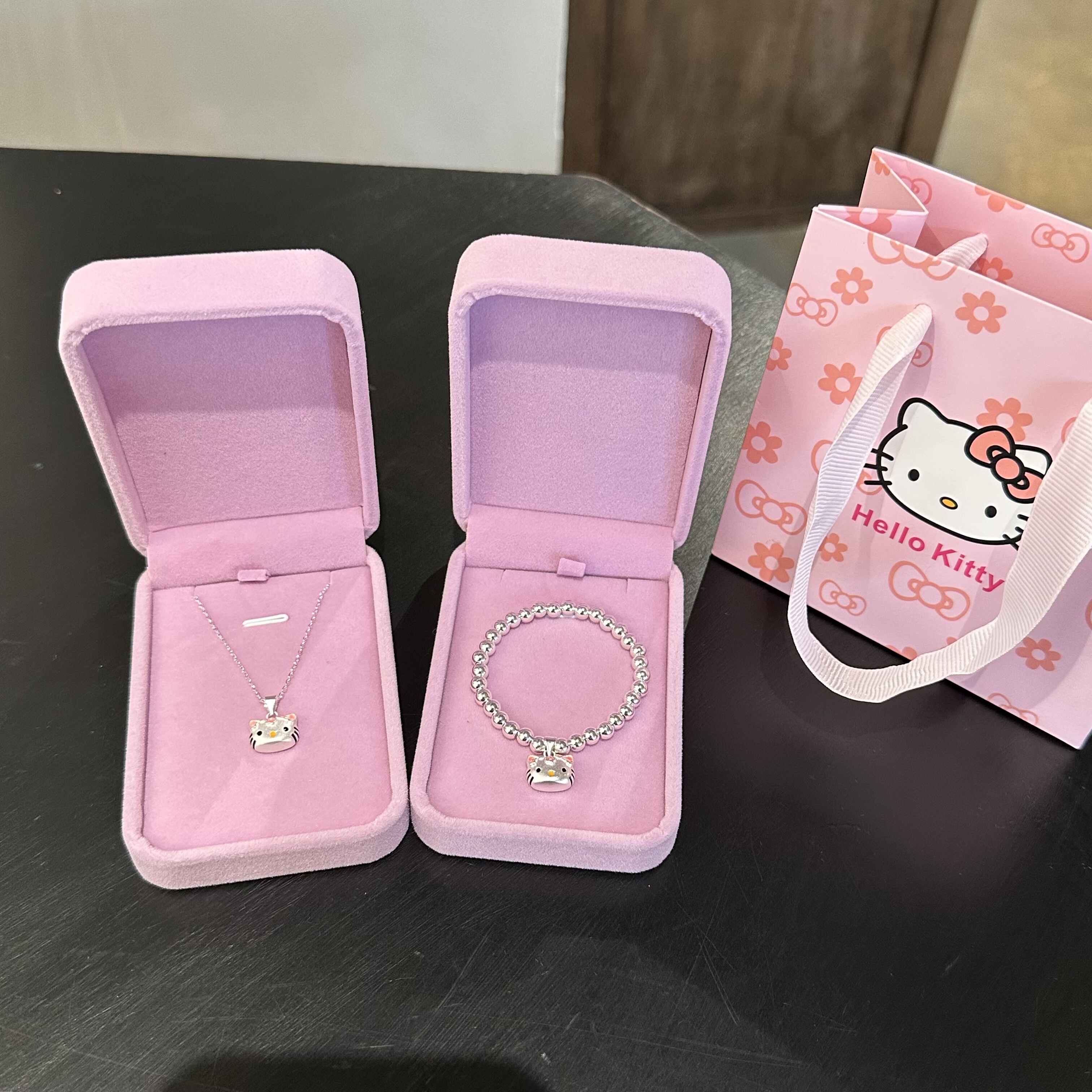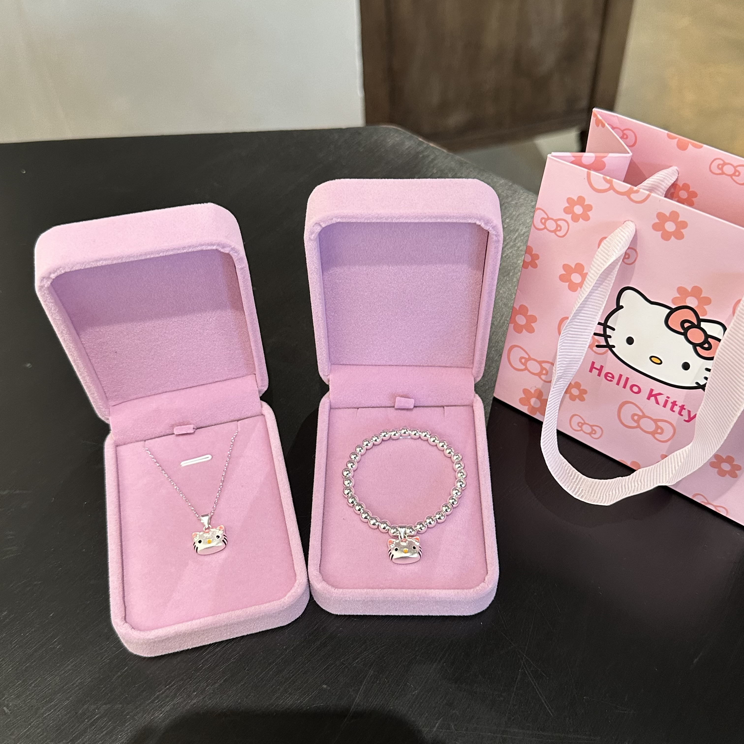 生日礼物纯银手串女甜美可爱Kitty吊坠项链宝宝大童银饰套装送人