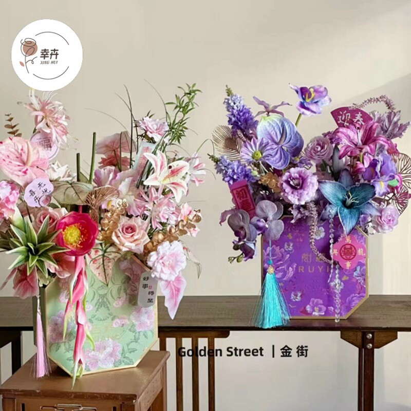 新年年宵花福桶烫金印花八角盒中国风冬青插花桶花盒新年礼盒