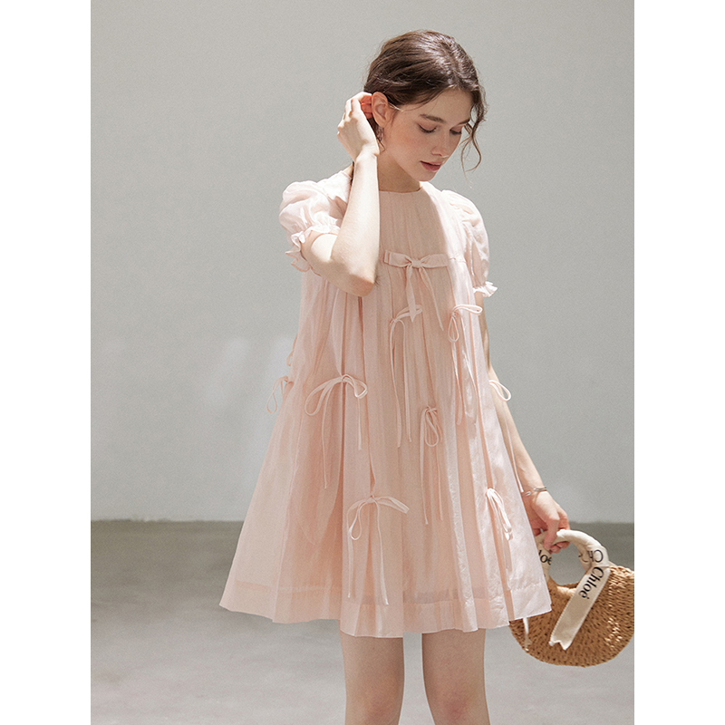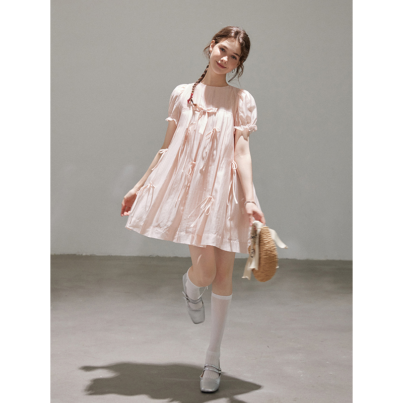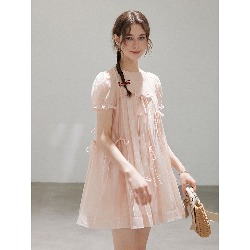 WPsense原创粉色蝴蝶结压褶天丝短袖连衣裙女夏设计感甜美短裙子