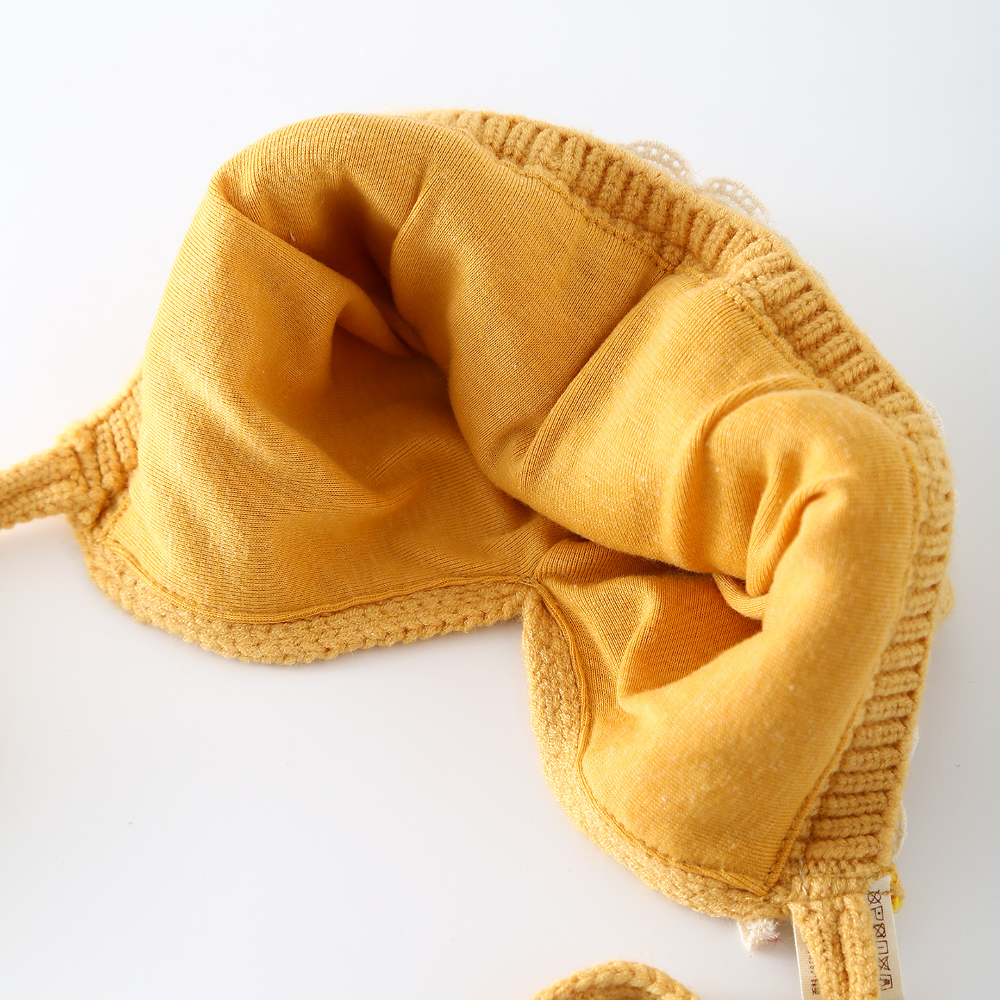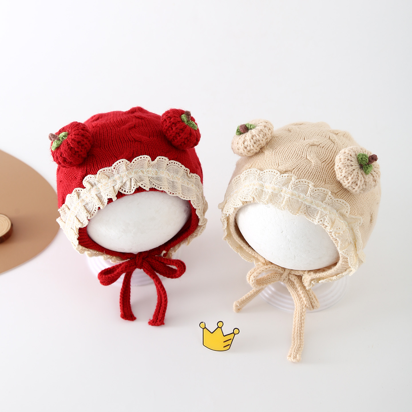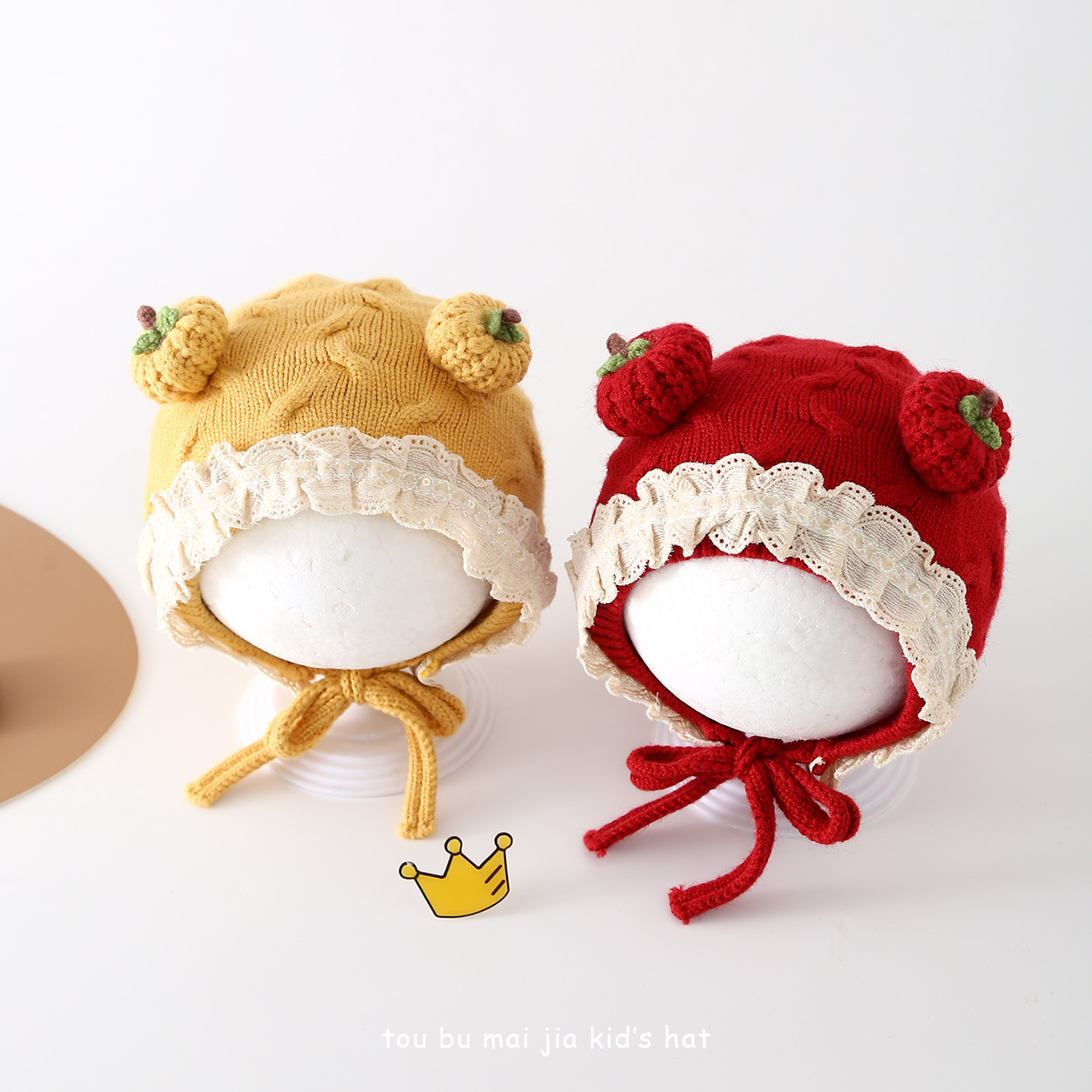 婴儿帽子秋冬季套头帽婴幼儿护耳帽女宝宝公主花边可爱超萌毛线帽