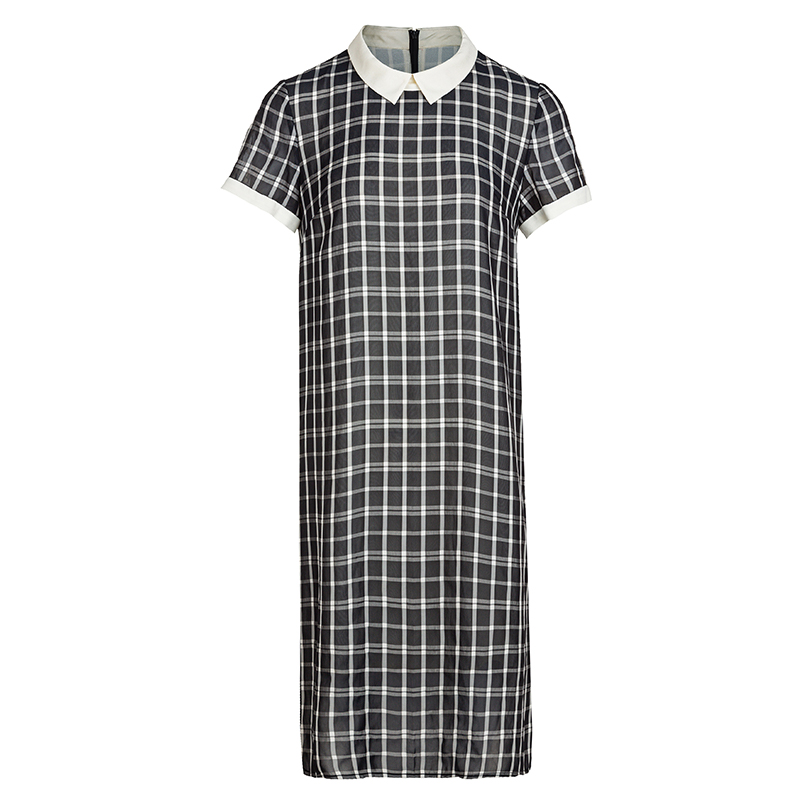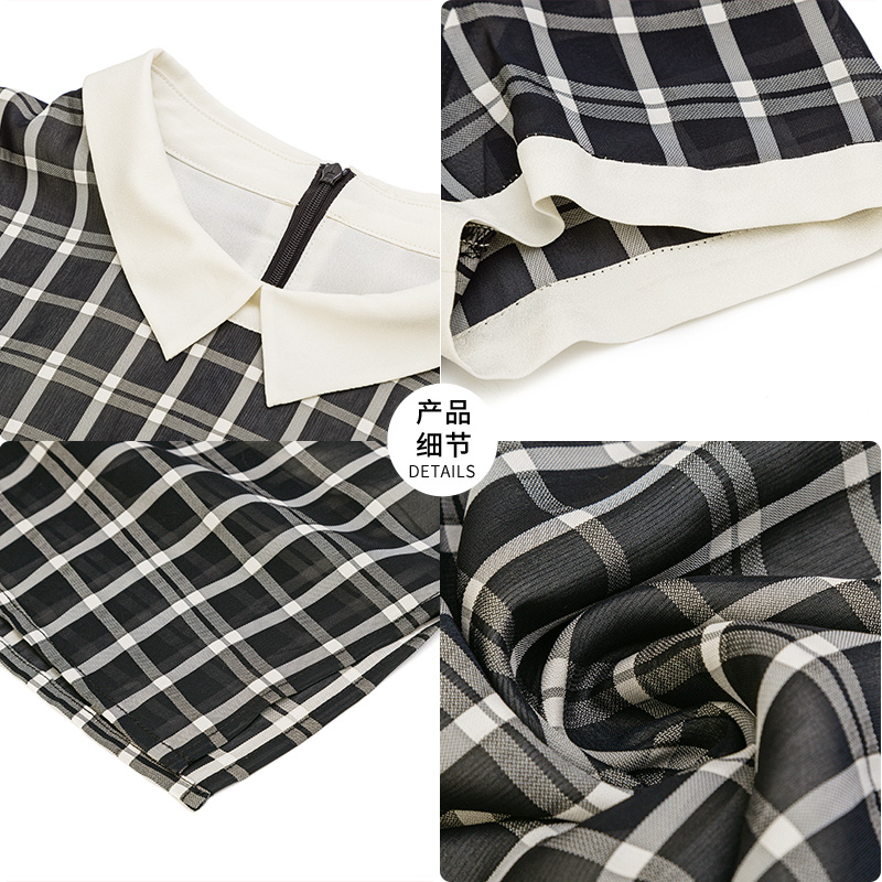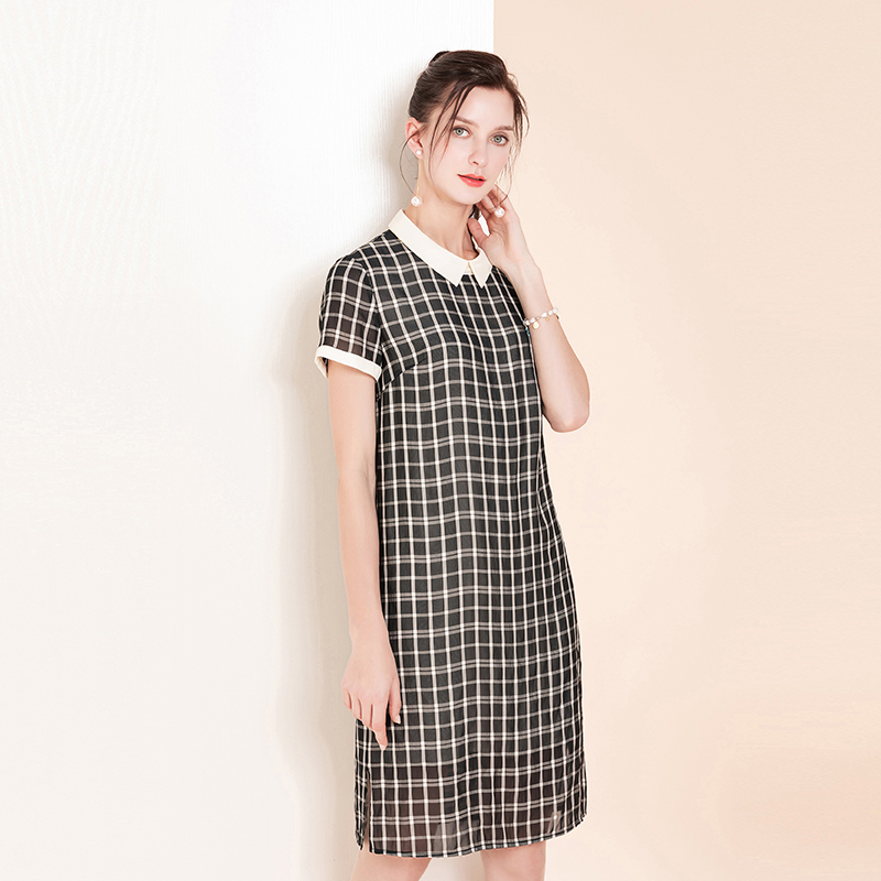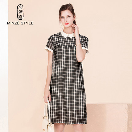 名师路格子连衣裙女夏季新款宽松腰POLO领短袖中长裙莱赛尔