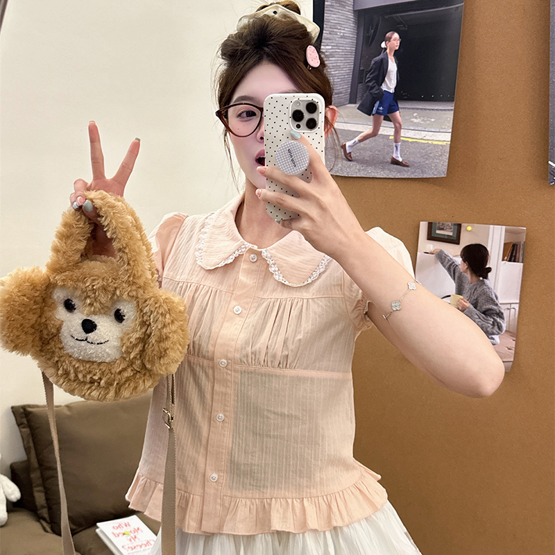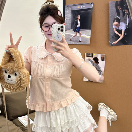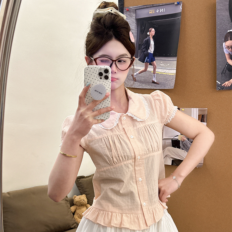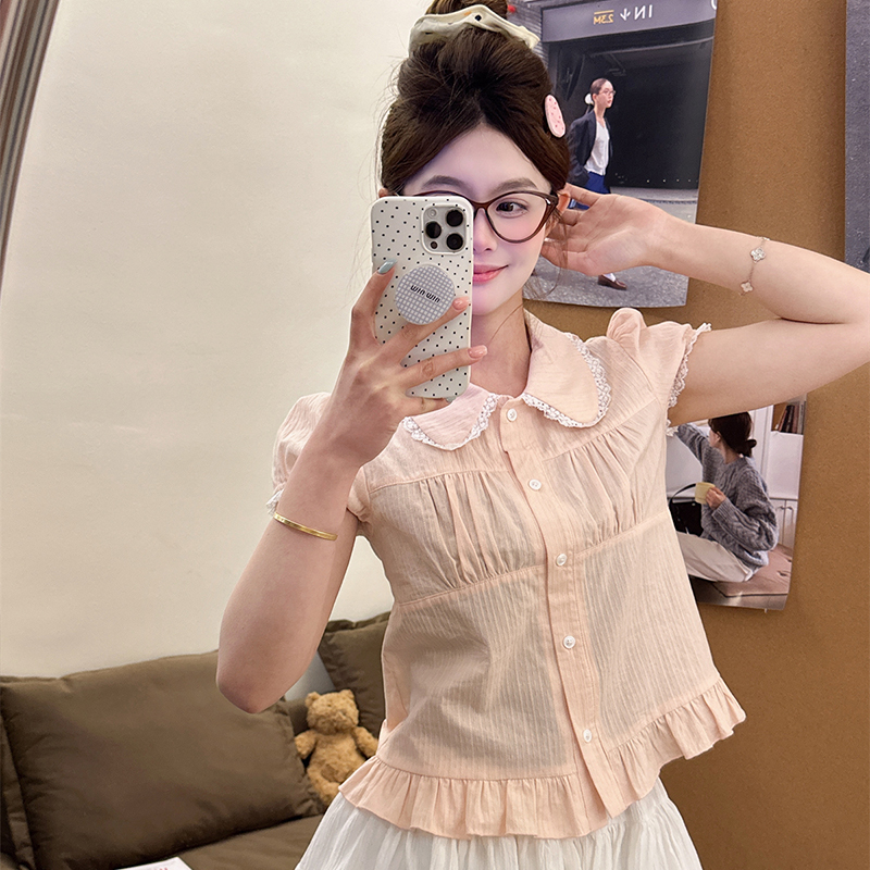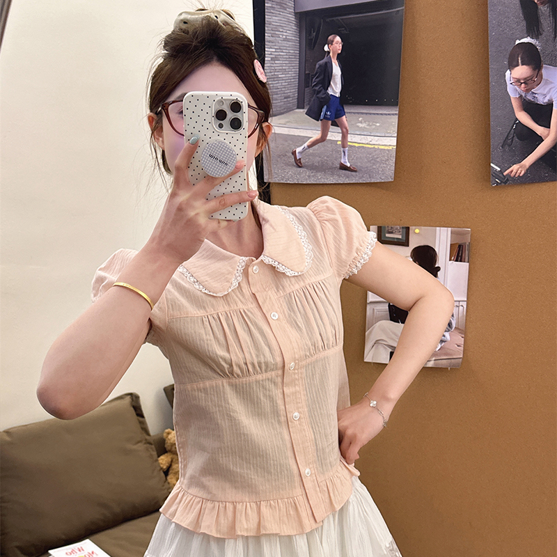 粉色娃娃领蕾丝花边泡泡袖少女短袖衬衫女夏季小个子显瘦短款上衣