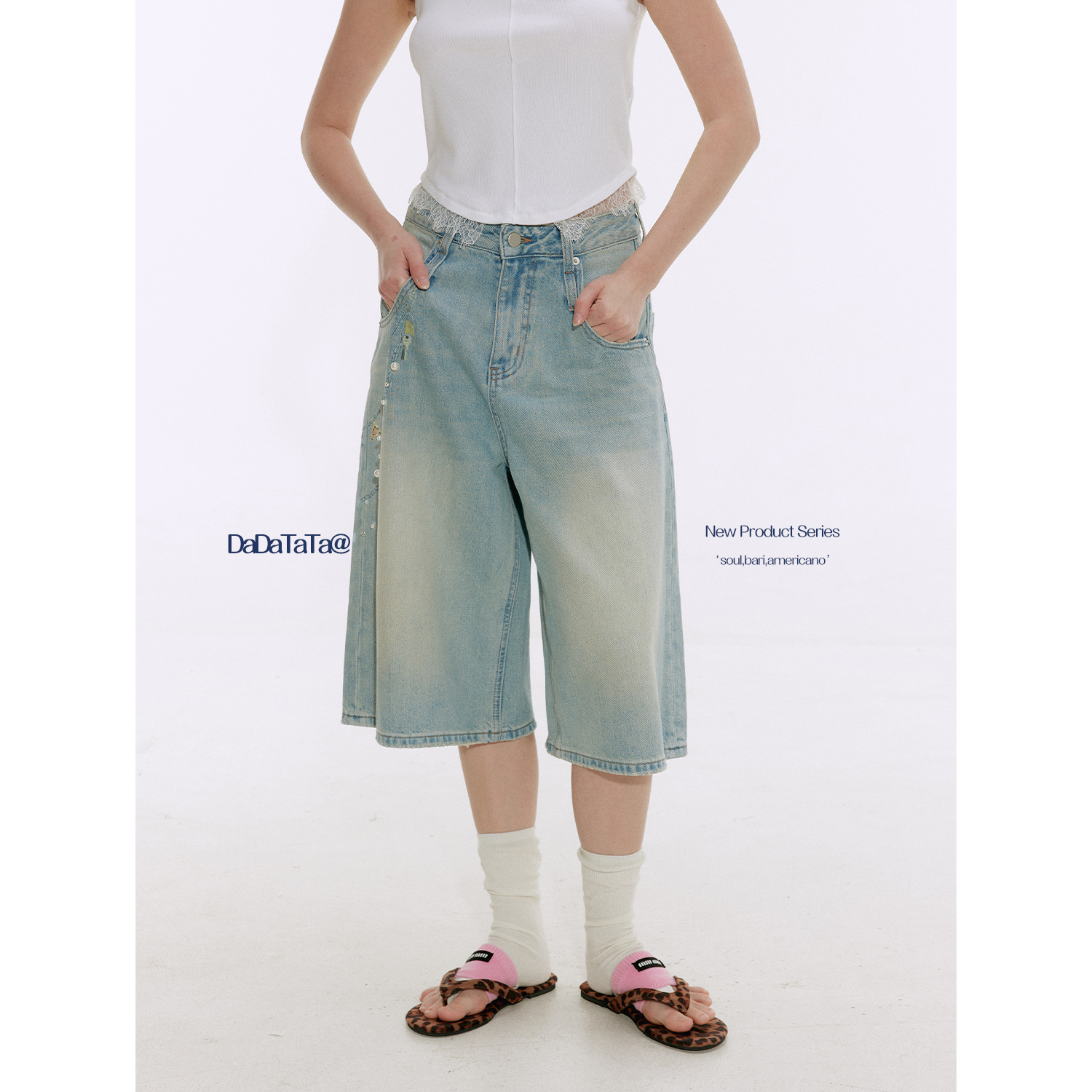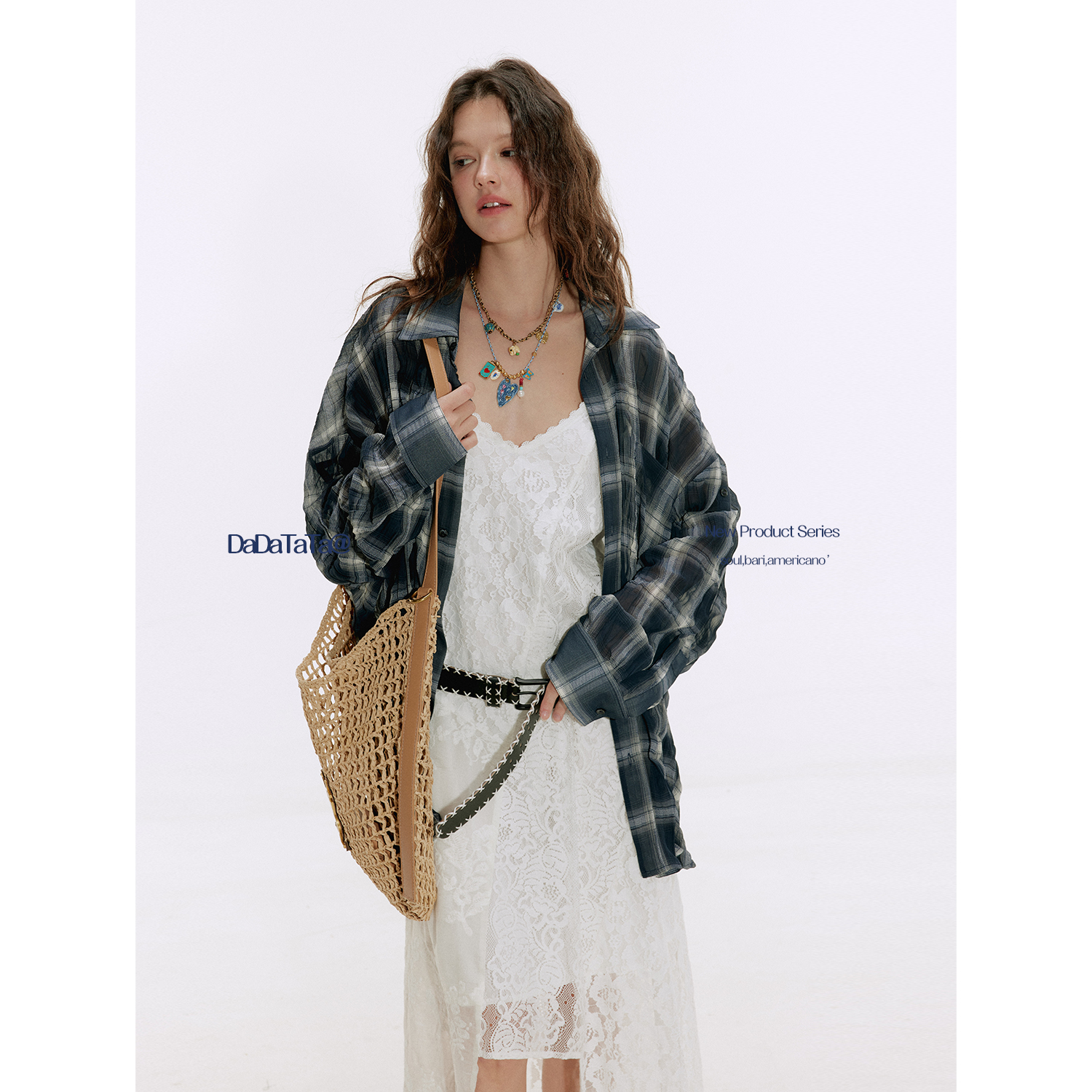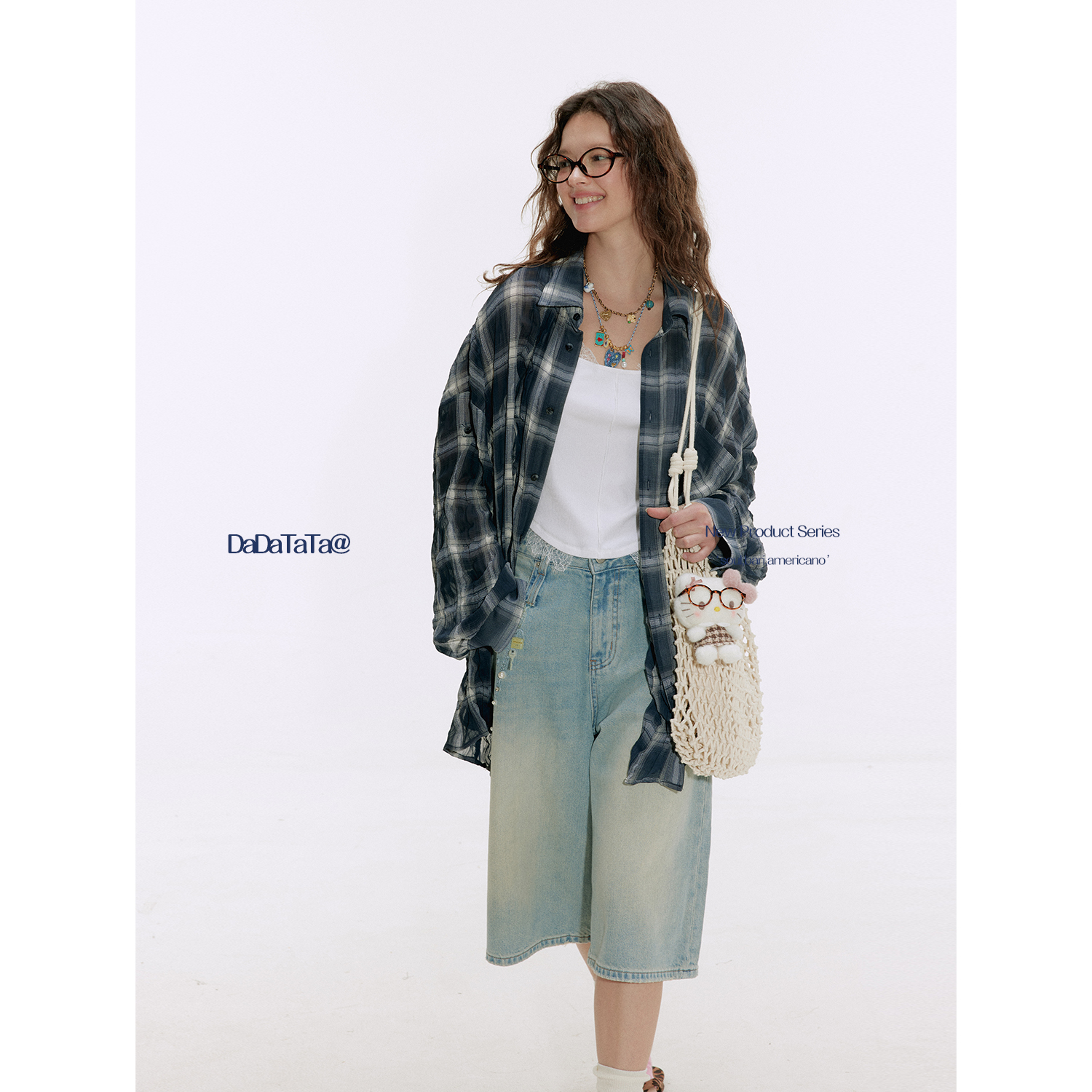 晶咕白标DADATATA格纹气质衬衫链条印花牛仔中裤蕾丝吊带裙套装