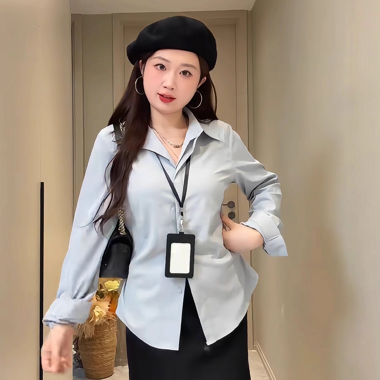大码女装胖mm法式设计感翻领掐腰长袖衬衫秋季巨显瘦遮肉内搭上衣
