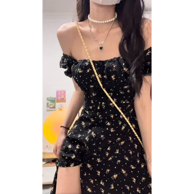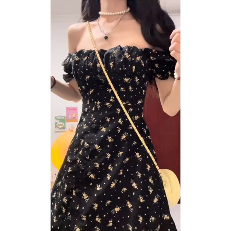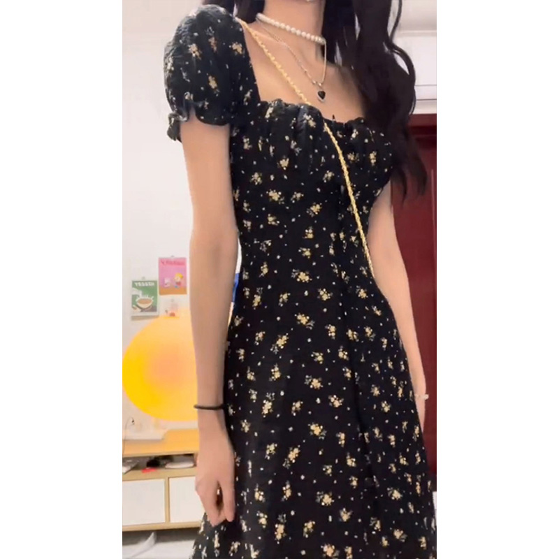 法式气质百搭小黑裙系带碎花连衣裙女新款夏小个子学生高级感裙子