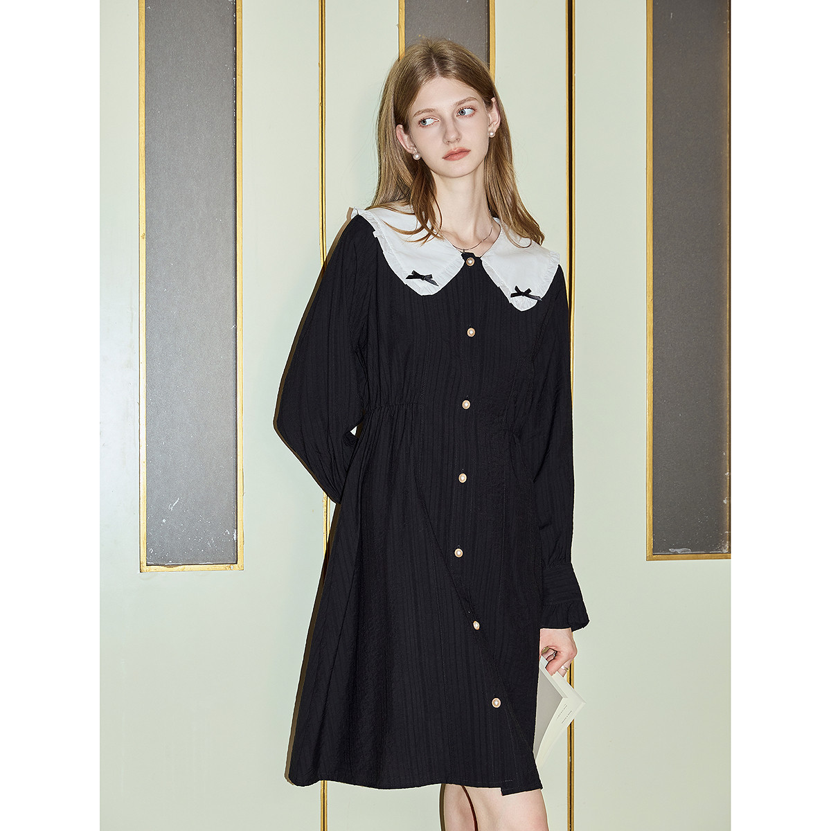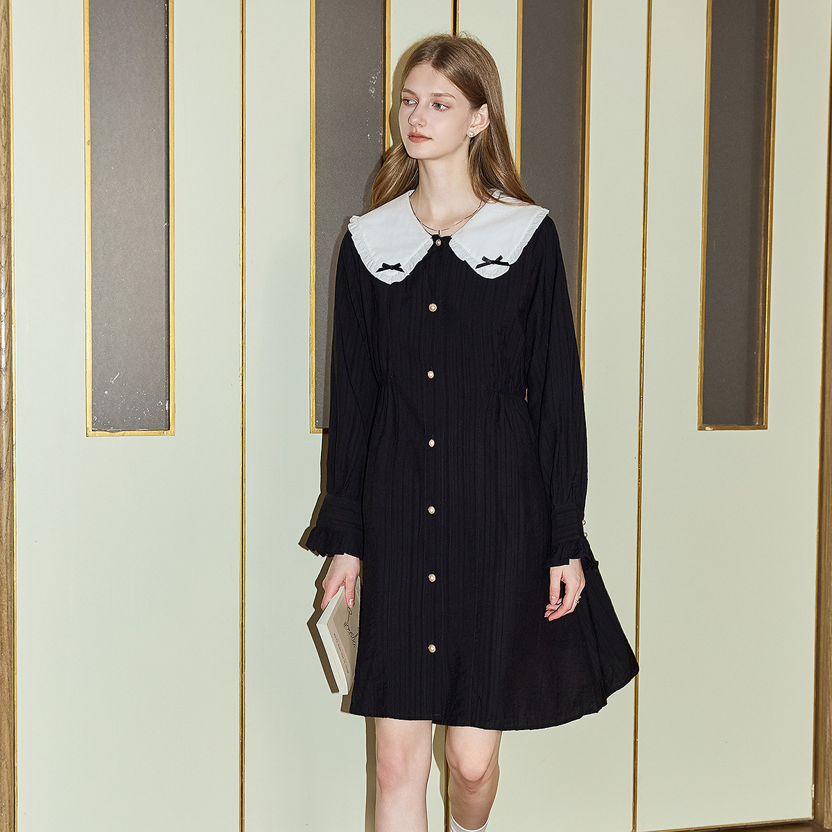 唐狮春装长袖连衣裙女2026早春新款娃娃领衬衫裙小个子黑色裙子