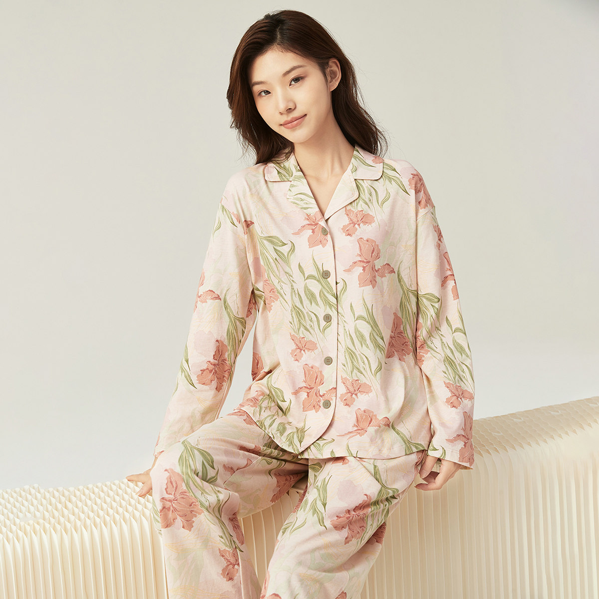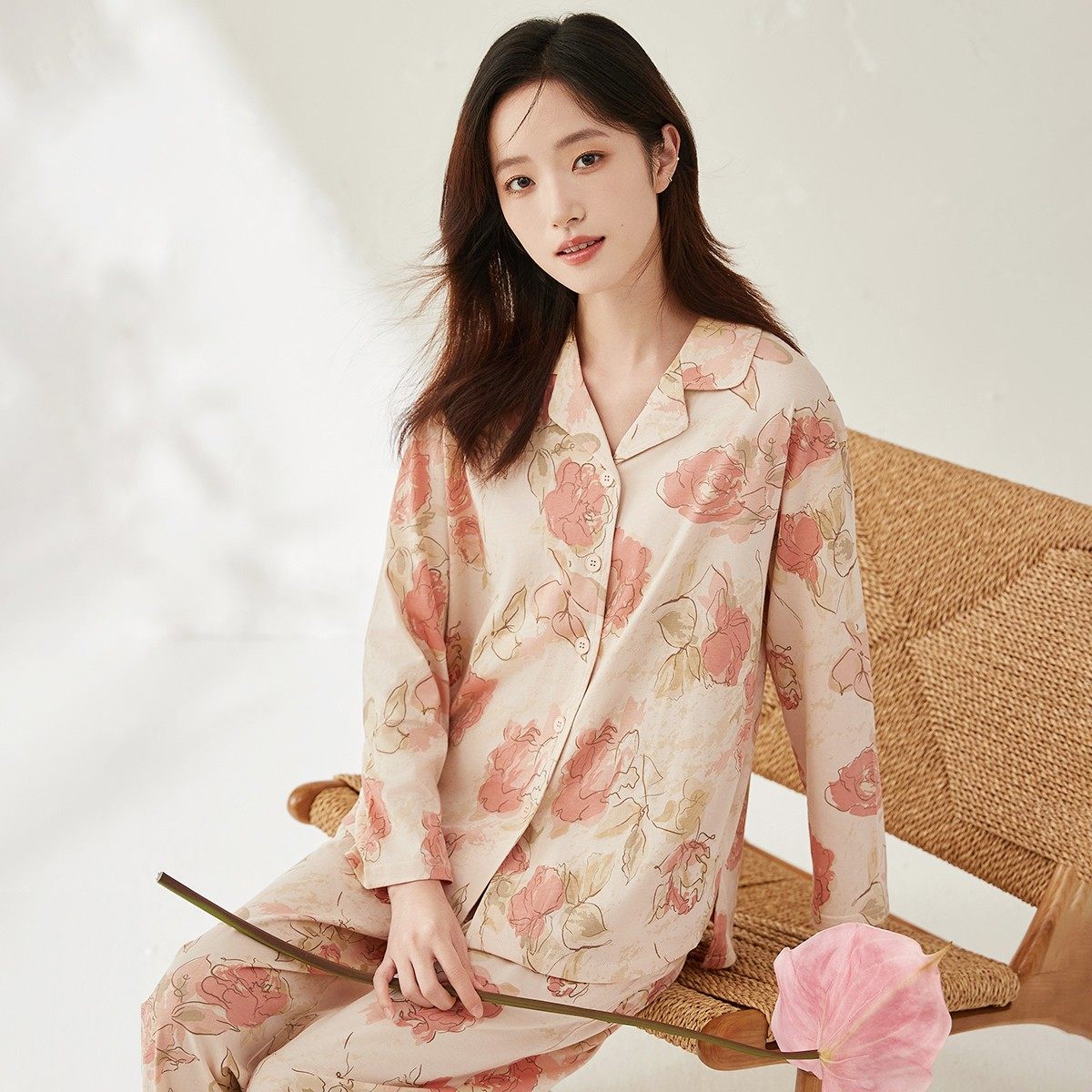 顶呱呱睡衣女春秋款全棉宽松长袖开衫翻领纯棉套装秋冬休闲家居服