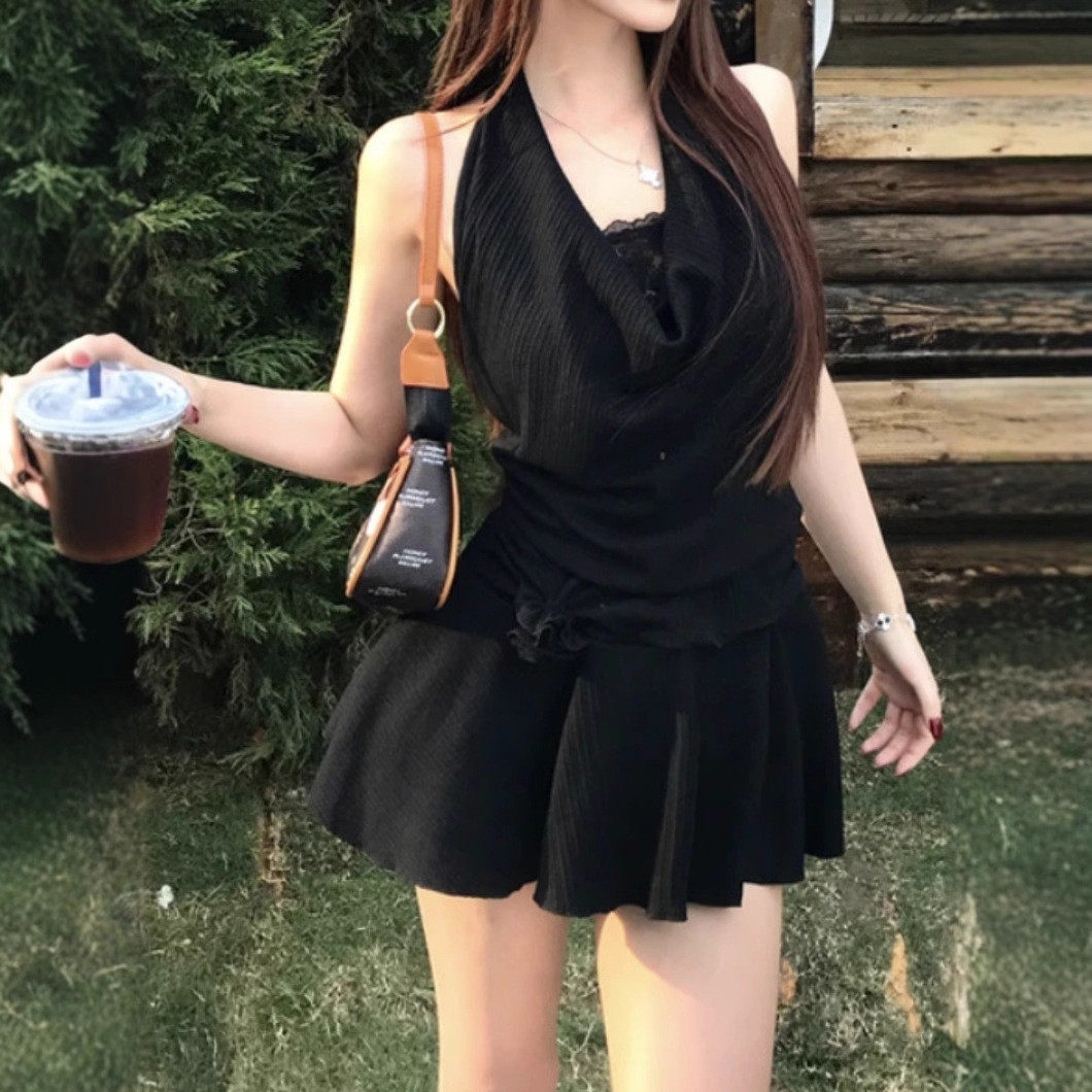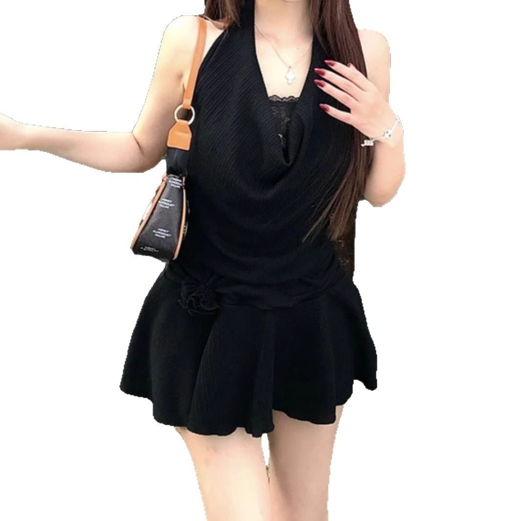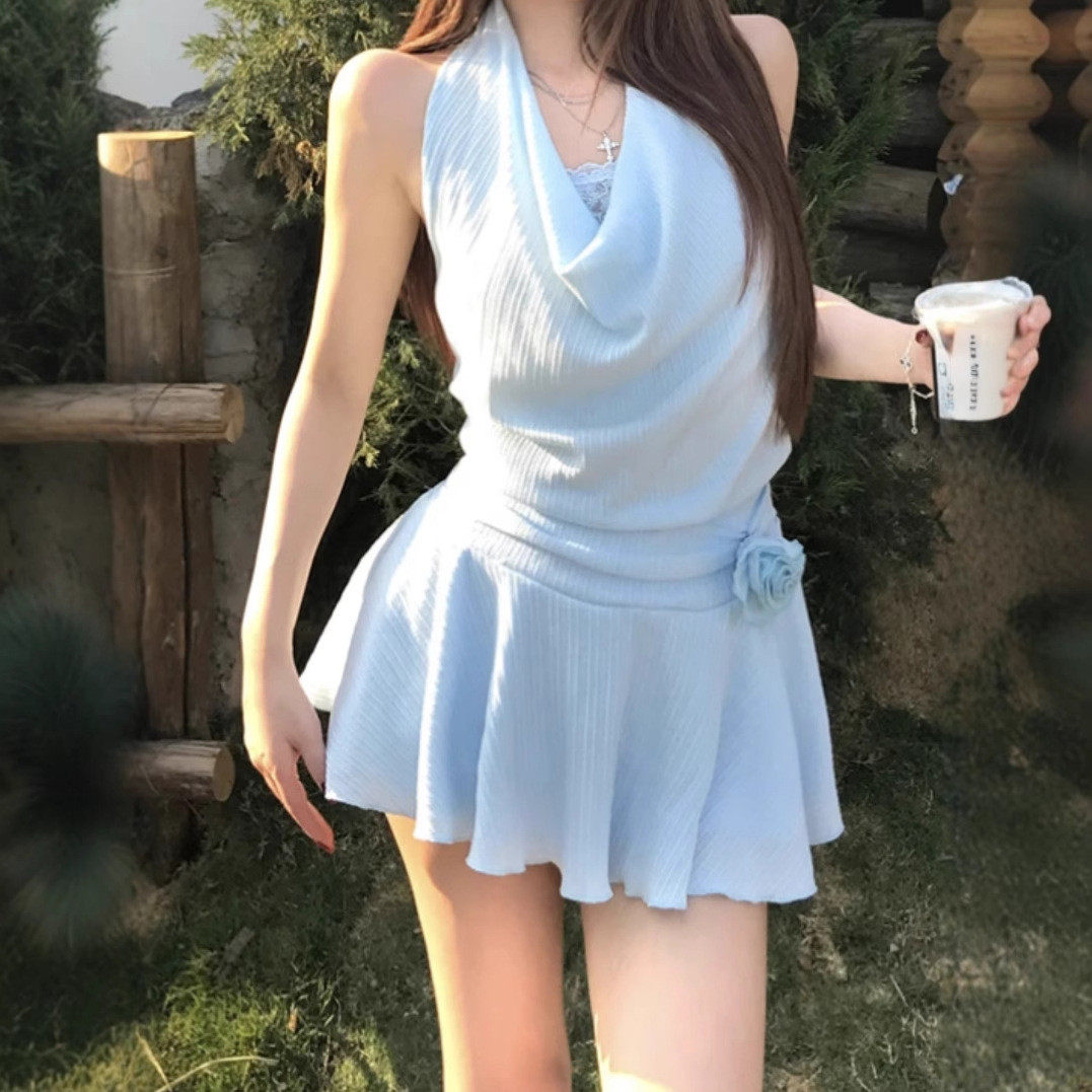 田曦薇同款蓝色玫瑰连衣裙挂脖修身温柔舒适高腰显瘦纯欲性感辣妹