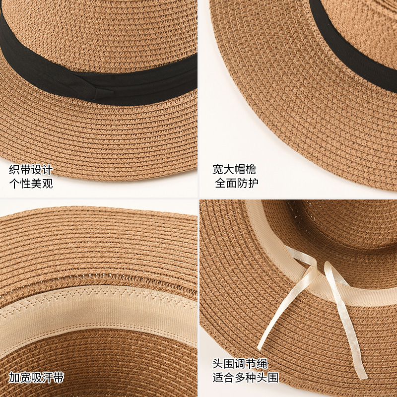 2025新款法式平顶草帽女夏季海边沙滩礼帽编织防晒大头围太阳帽子