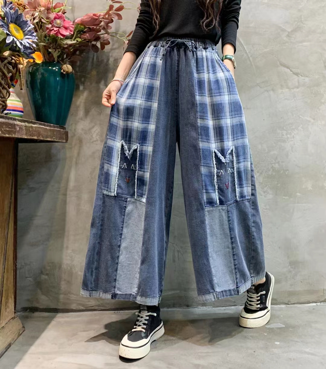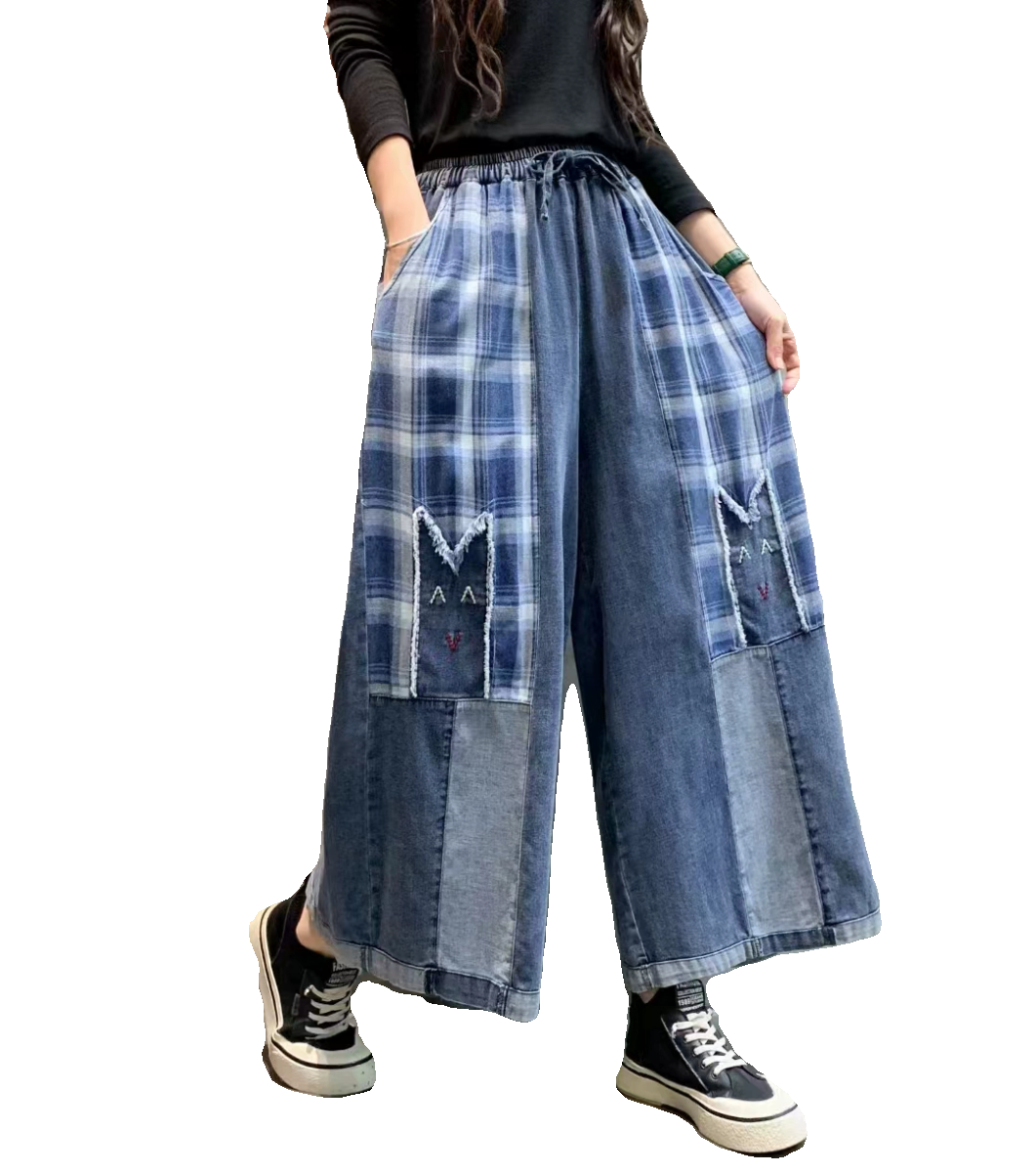 夏季新款拼色柔软牛仔阔腿裤 拼色格子九分裤大码休闲宽松裙裤