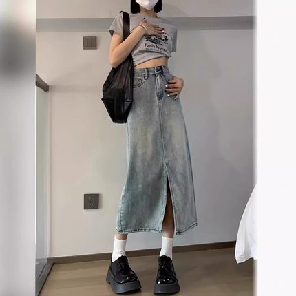 开叉牛仔半身裙女夏季2025新款小个子a字中长款浅色高腰裙子秋