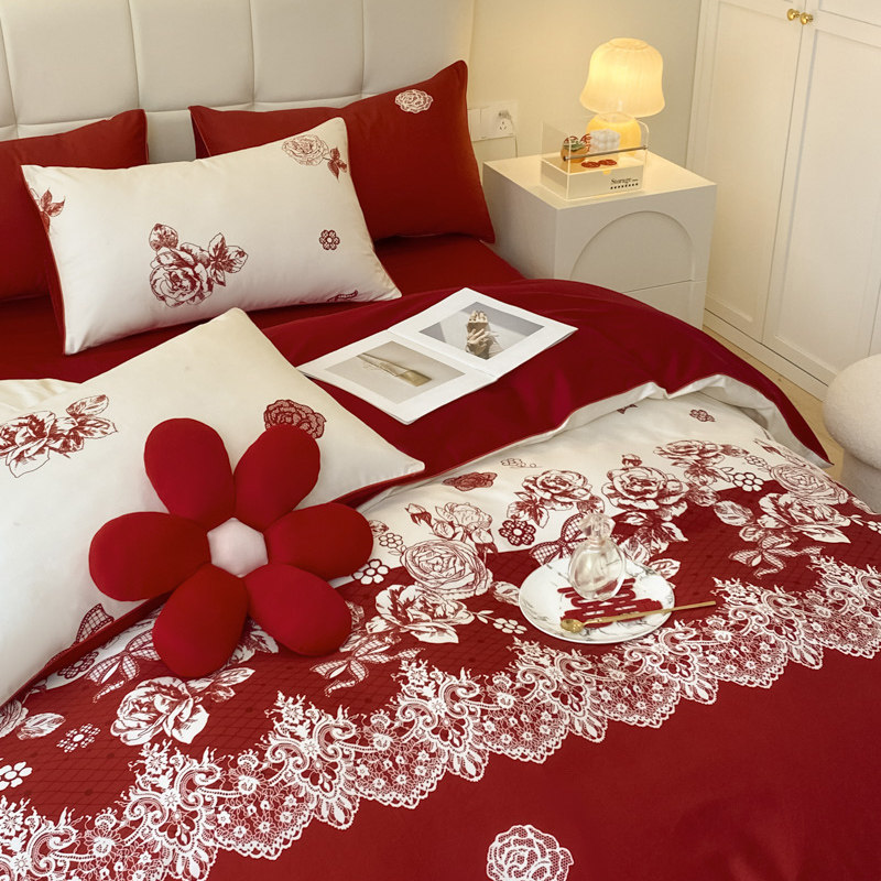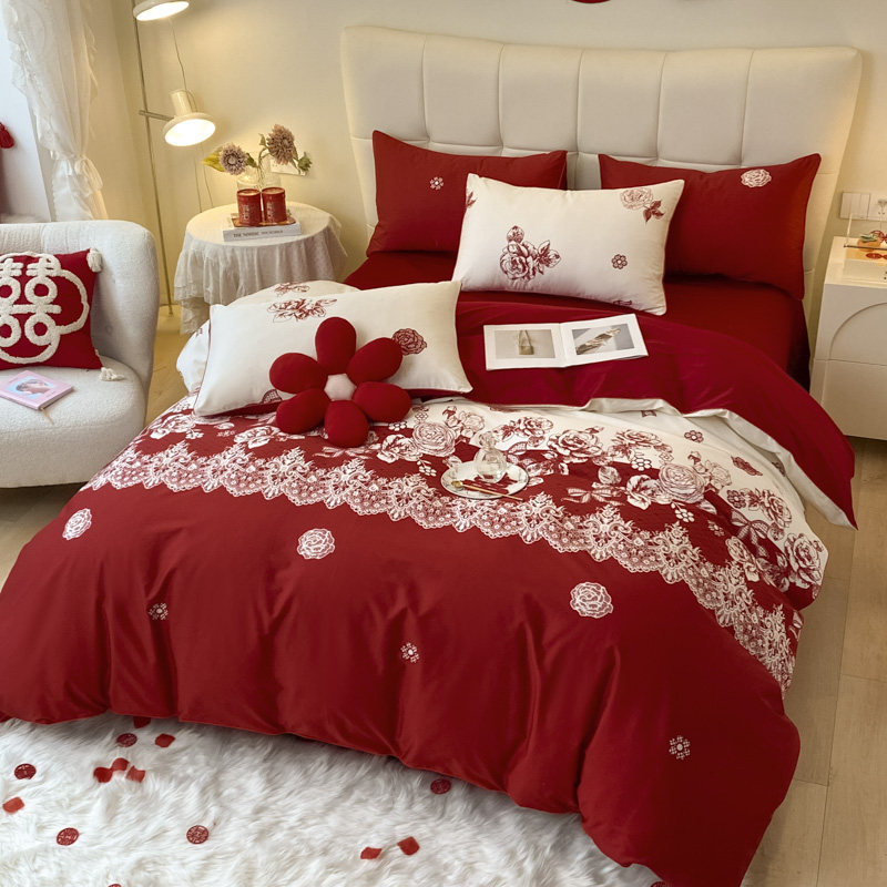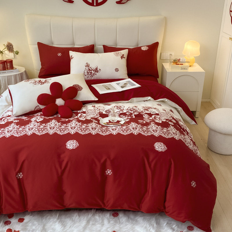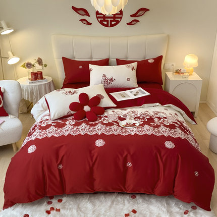 结婚床上用品四件套大红新婚庆陪嫁礼高档婚房简约喜庆被套床单笠