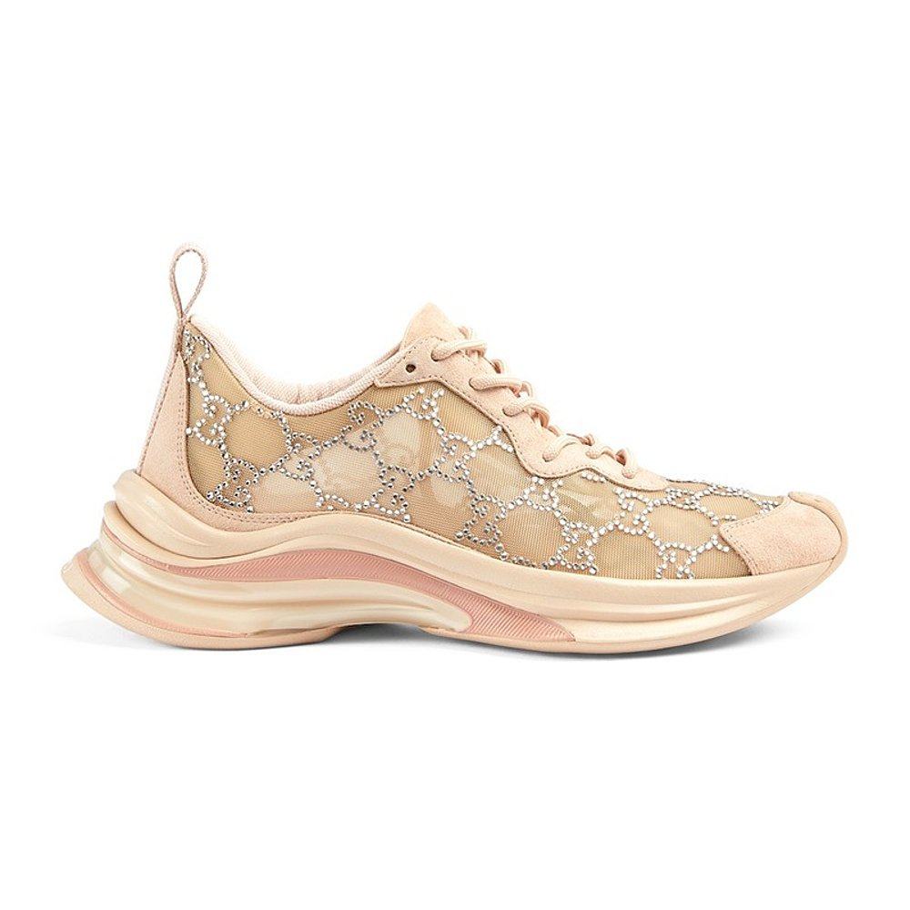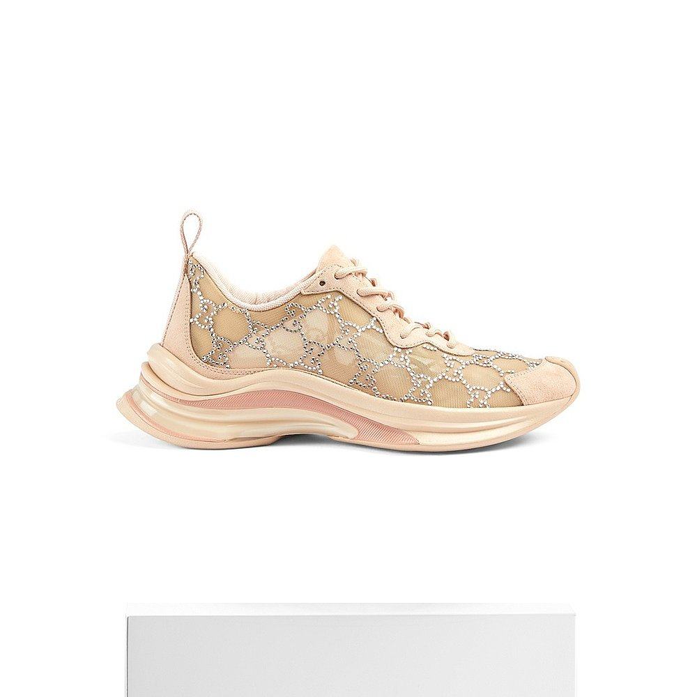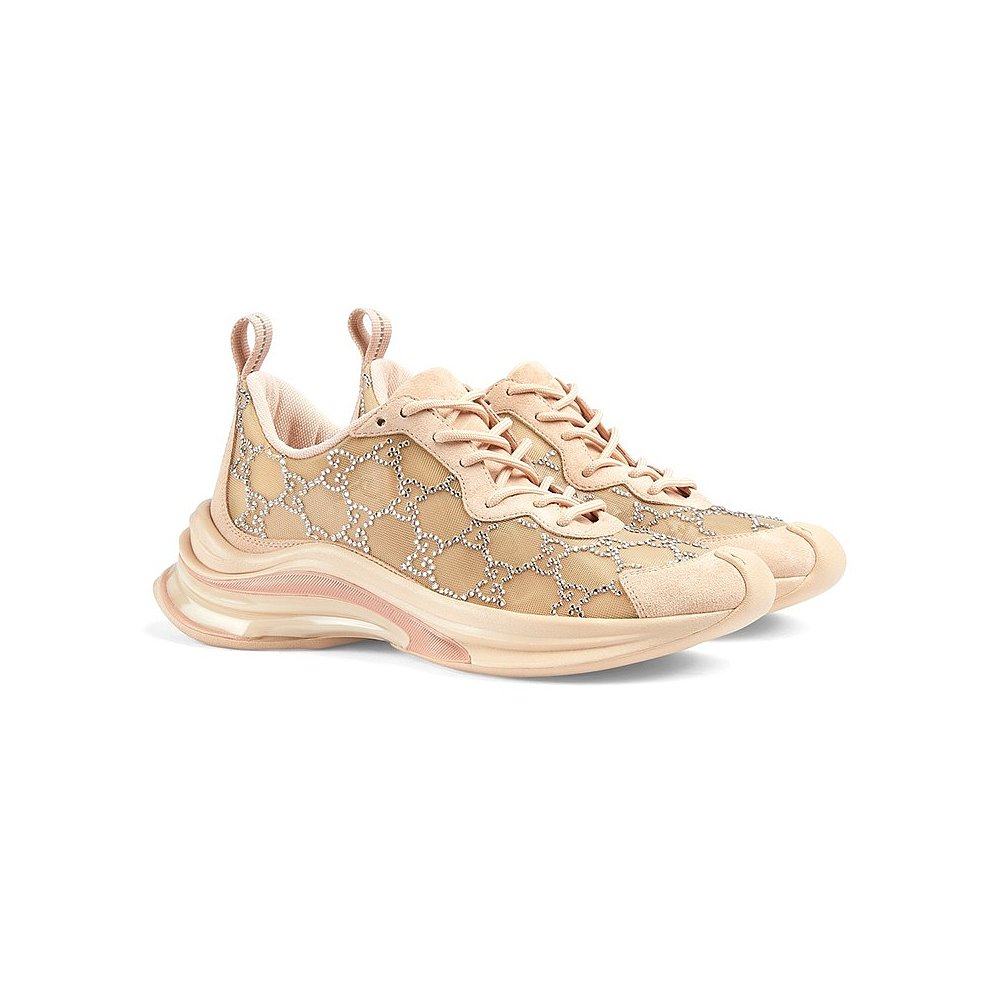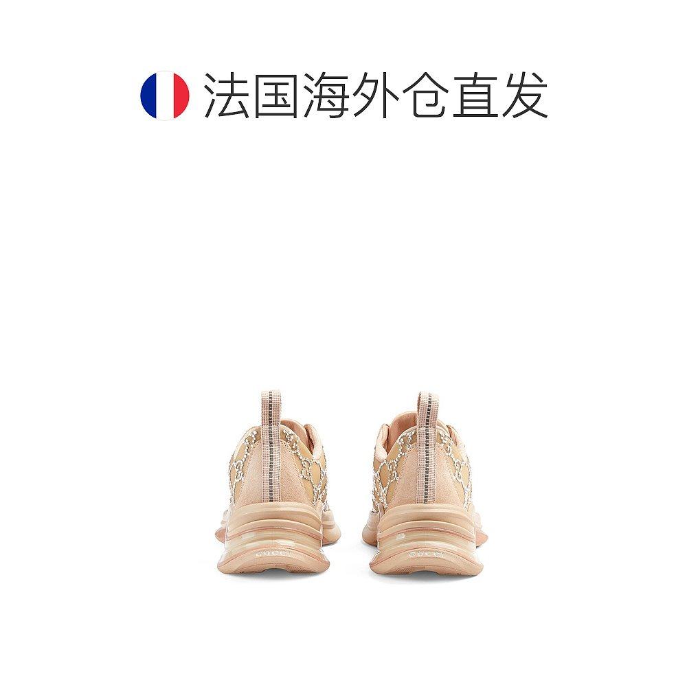 自营欧洲直邮GUCCI/古驰 女士粉棕色织物水钻网眼拼皮系带运动鞋