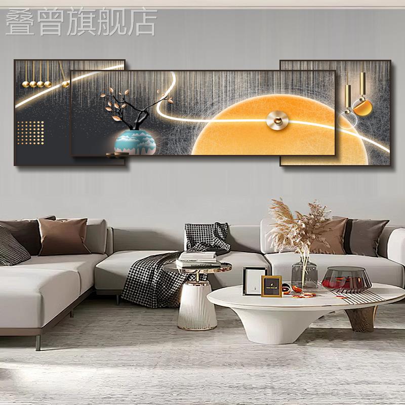 轻奢双层叠加装饰画客厅沙发背景墙三联挂画大气流水生财山水画