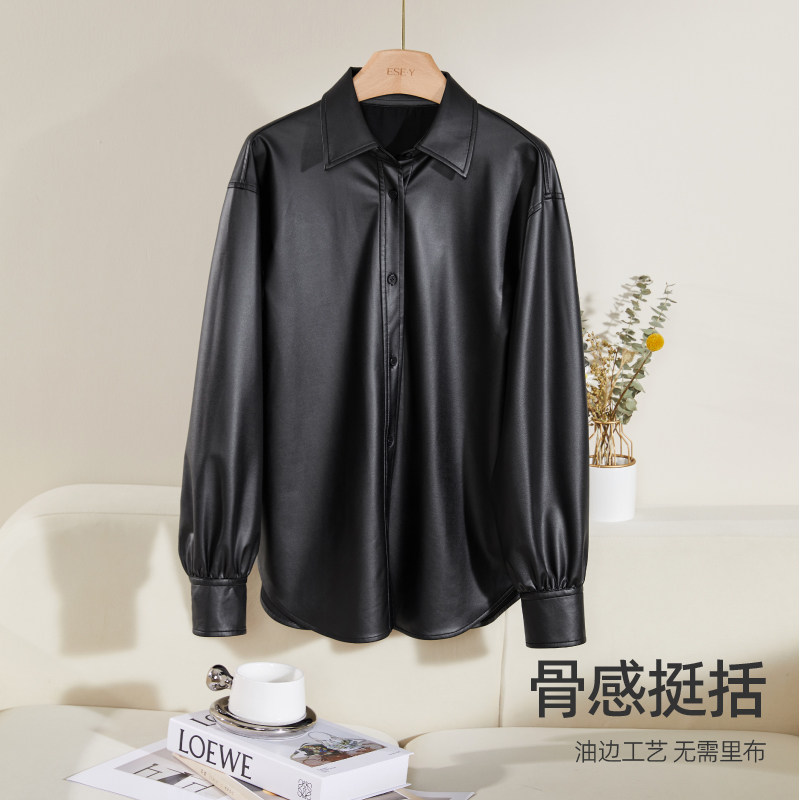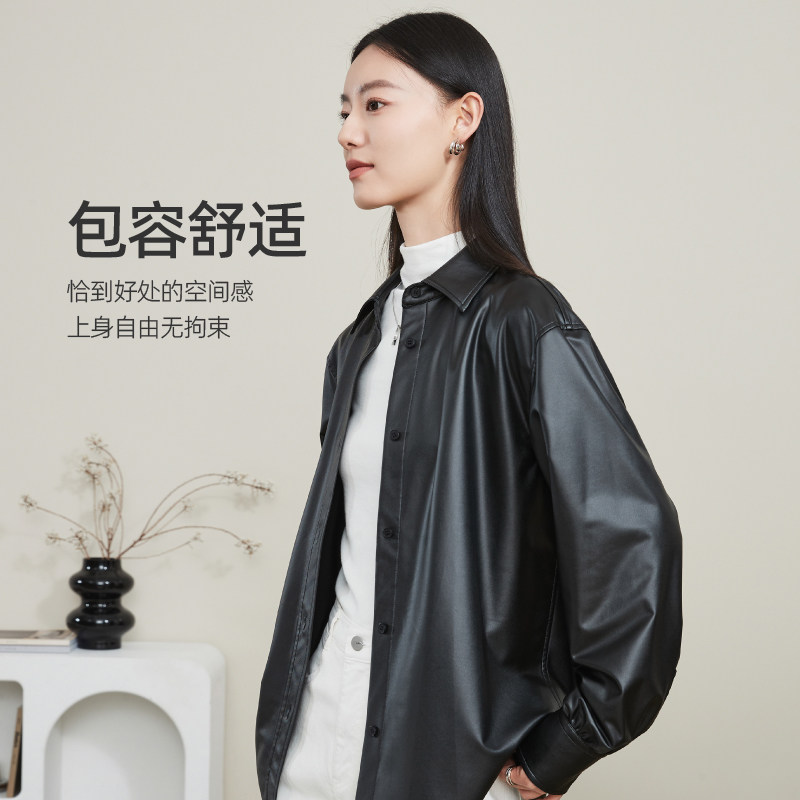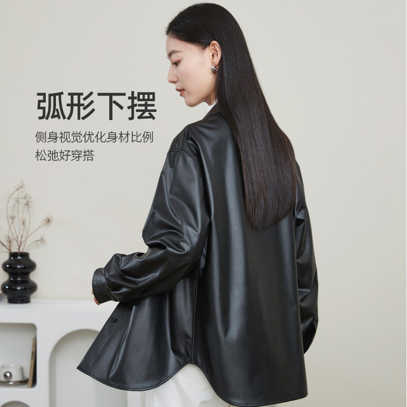 逸阳2025年春新款美式复古皮衣外套女高级感pu翻领皮夹克衬衫上衣