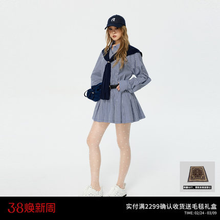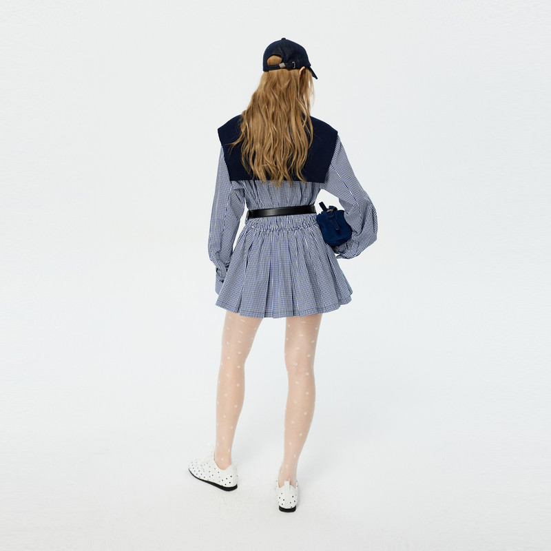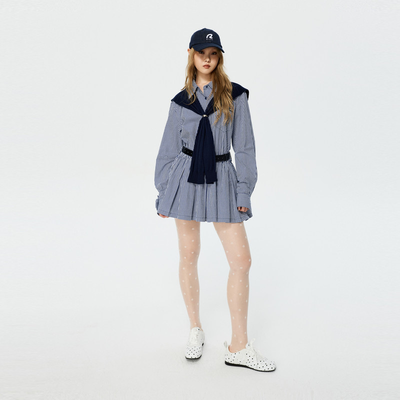 REVAN芮范设计师款经典蓝白格纹立体花袖连衣裙套装RK11101266