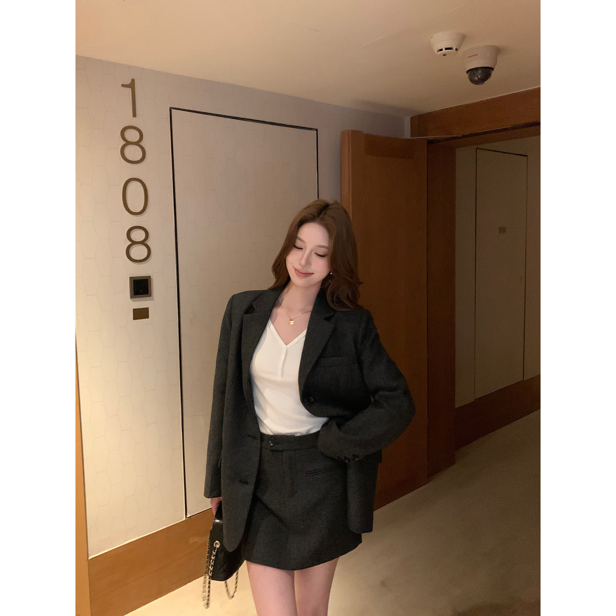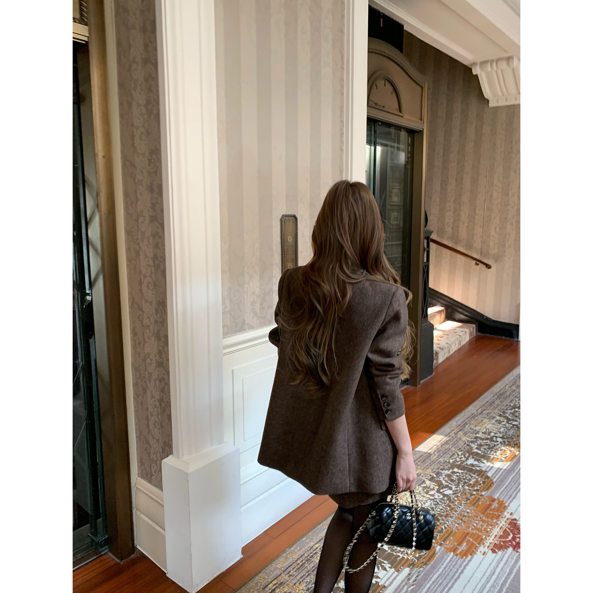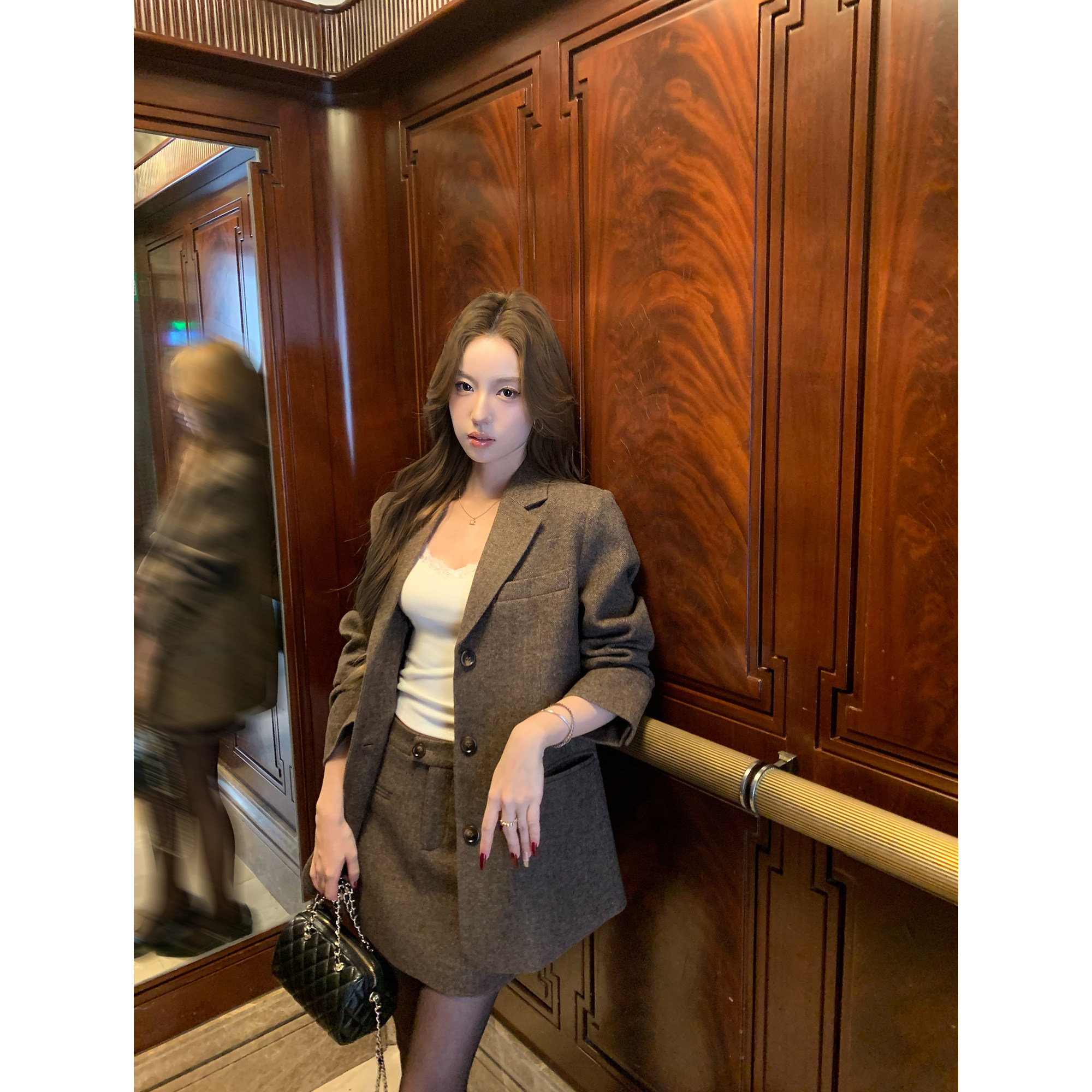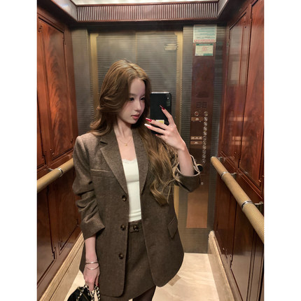 pusumede 复古摩登 棕色人字纹羊毛西装外套女气质毛呢半身裙套装
