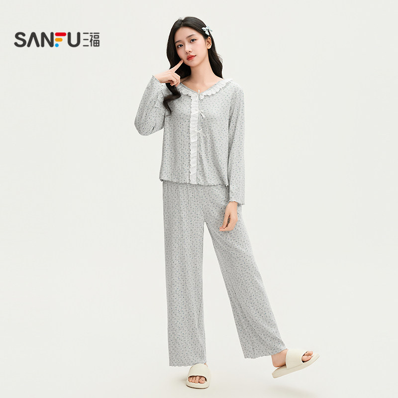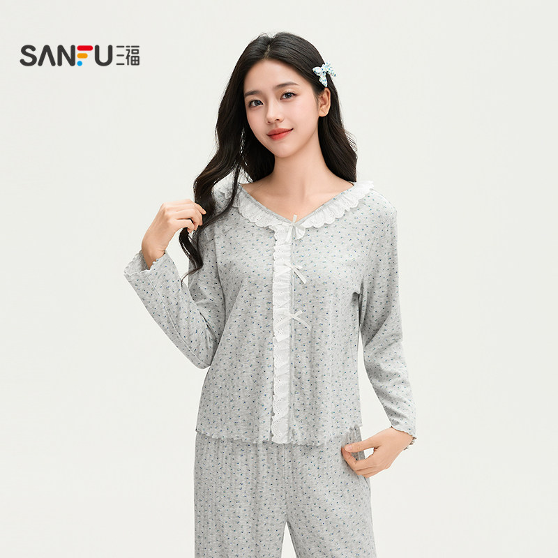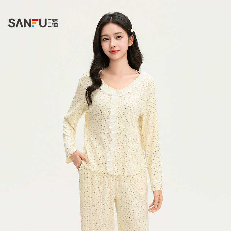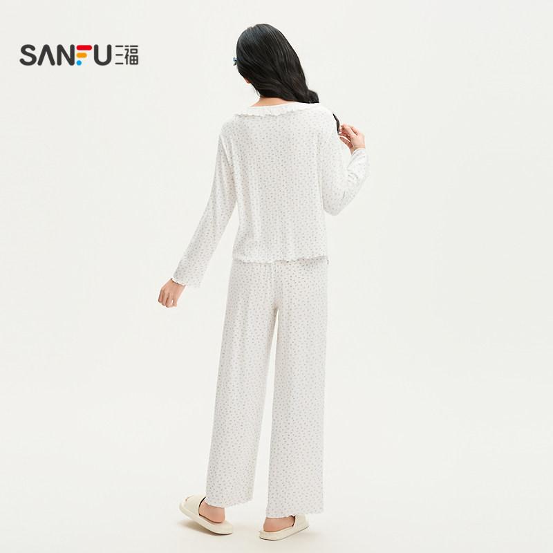 三福女春季花边领碎花长袖睡衣套装 甜系宽松家居服女514893