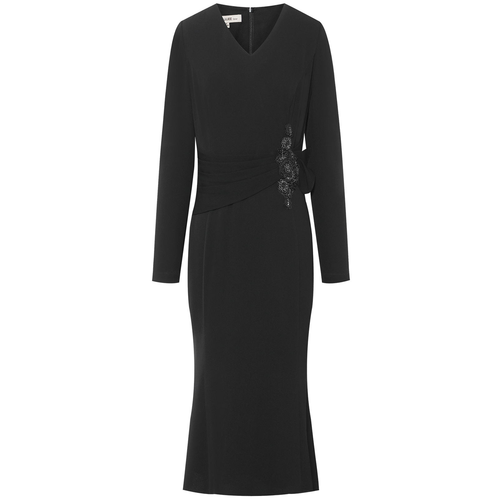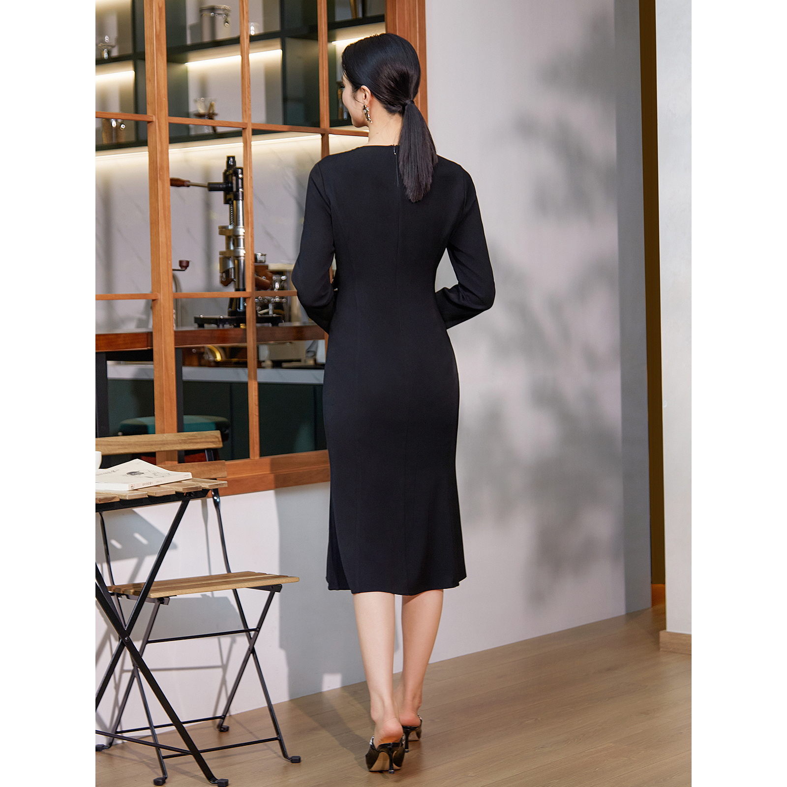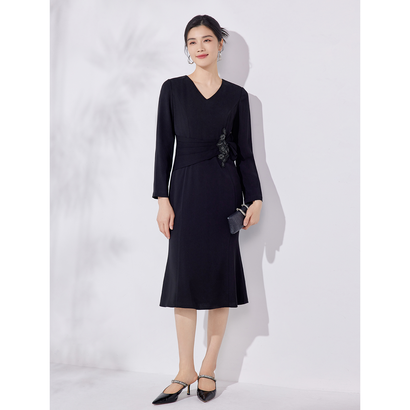 BBLLUUEE/粉蓝衣橱奢华鱼尾钉钻醋酸礼服裙女2025秋新款V领连衣裙