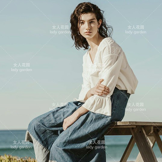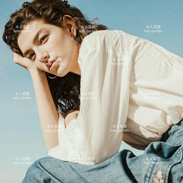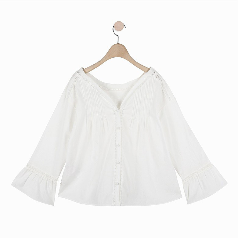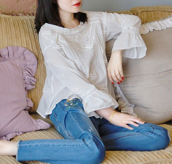 亏本回馈~韩国星期四岛屿白色布包扣刺绣花瓣袖边圆领V领衬衫衬衣