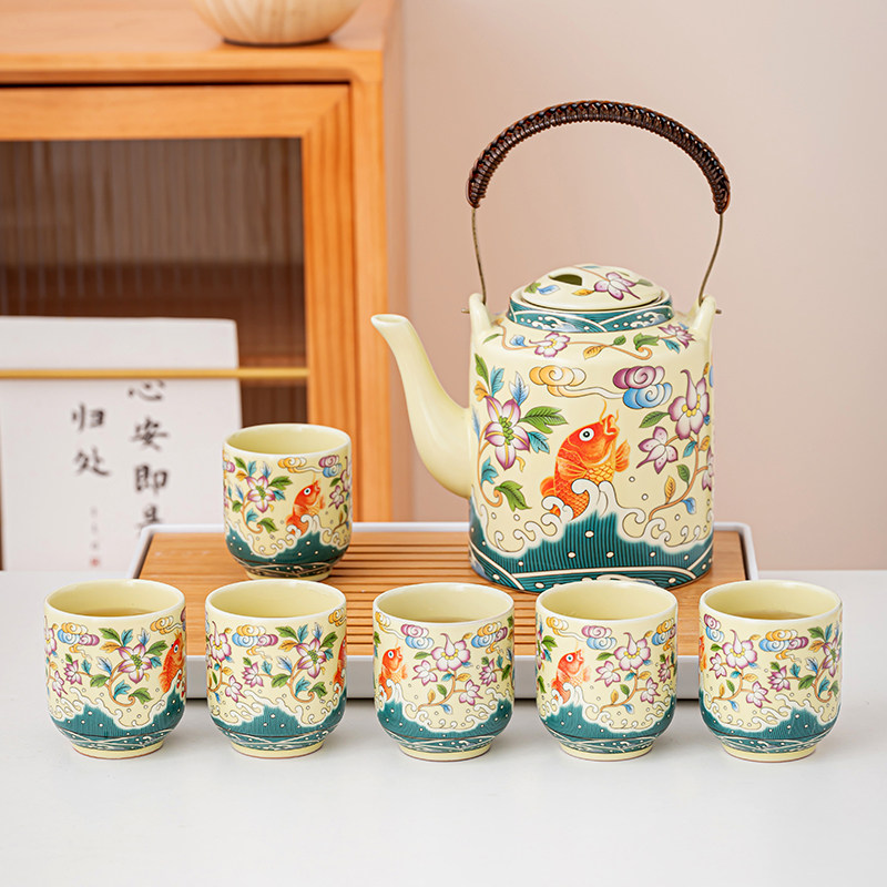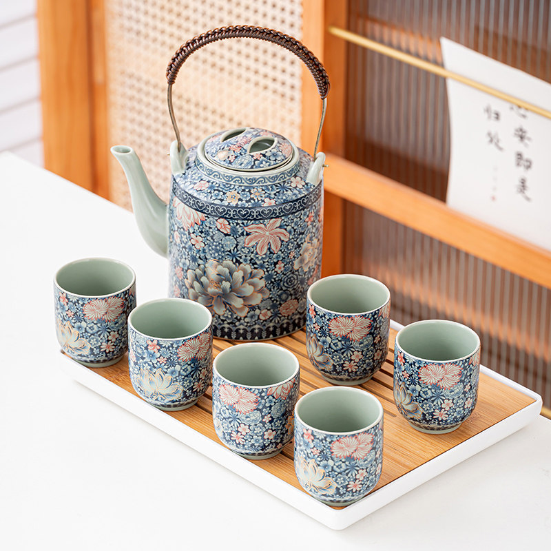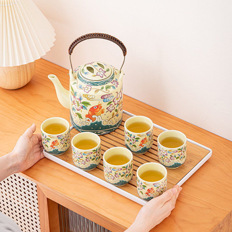 珐琅彩桥壶功夫茶具陶瓷家用办公汝窑大容量提梁茶壶茶杯一套高档