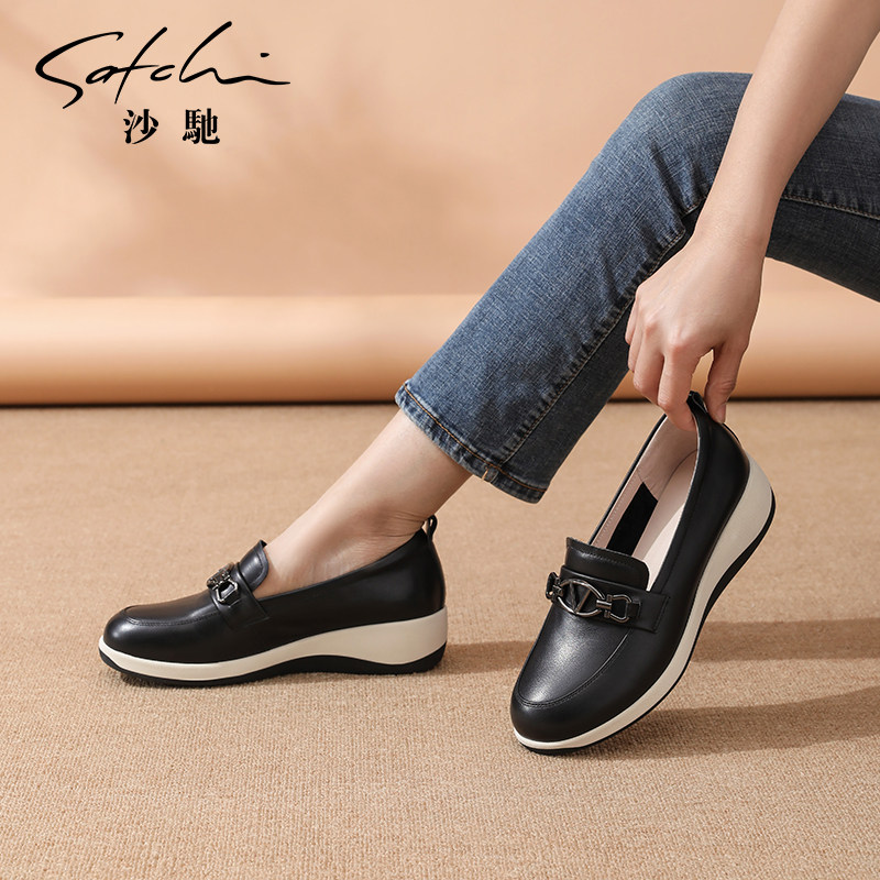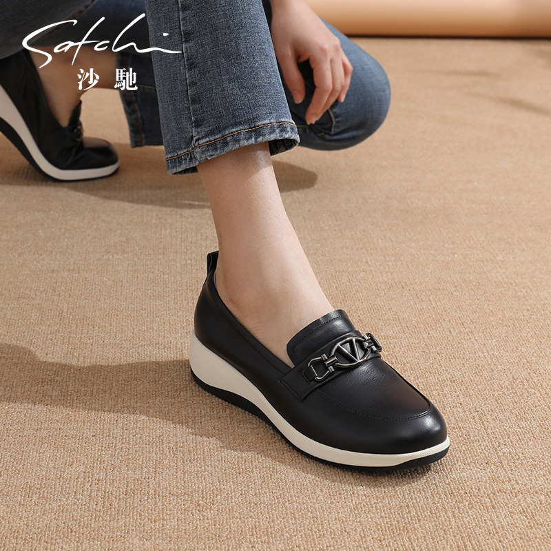 沙驰女鞋牛皮坡跟休闲乐福鞋女