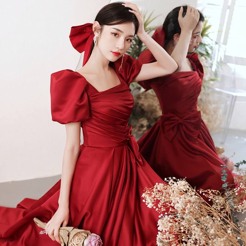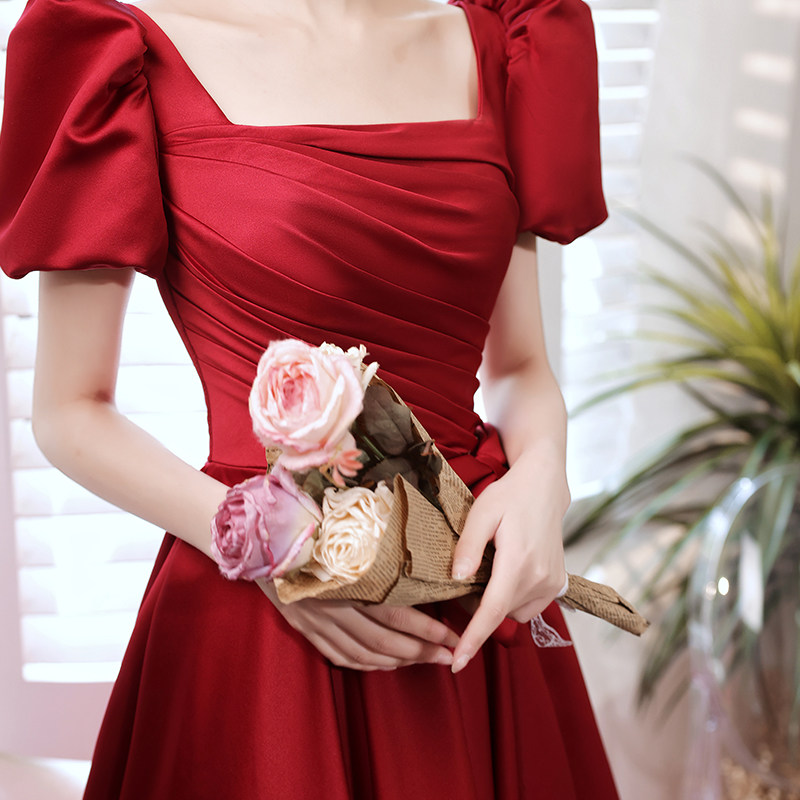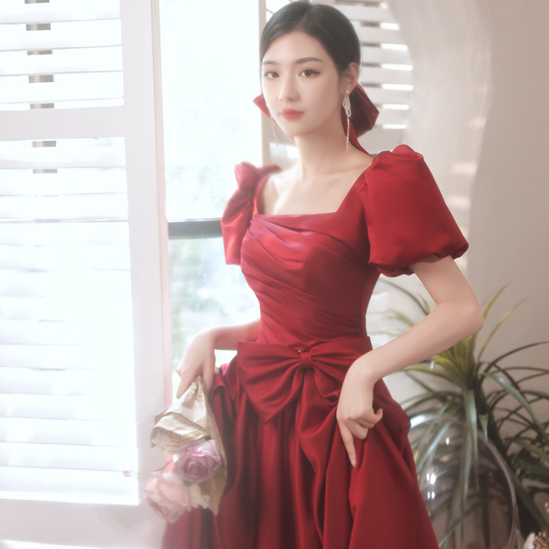 敬酒服新娘2025新款夏季遮手臂订婚连衣裙酒红色礼服小个子中长款