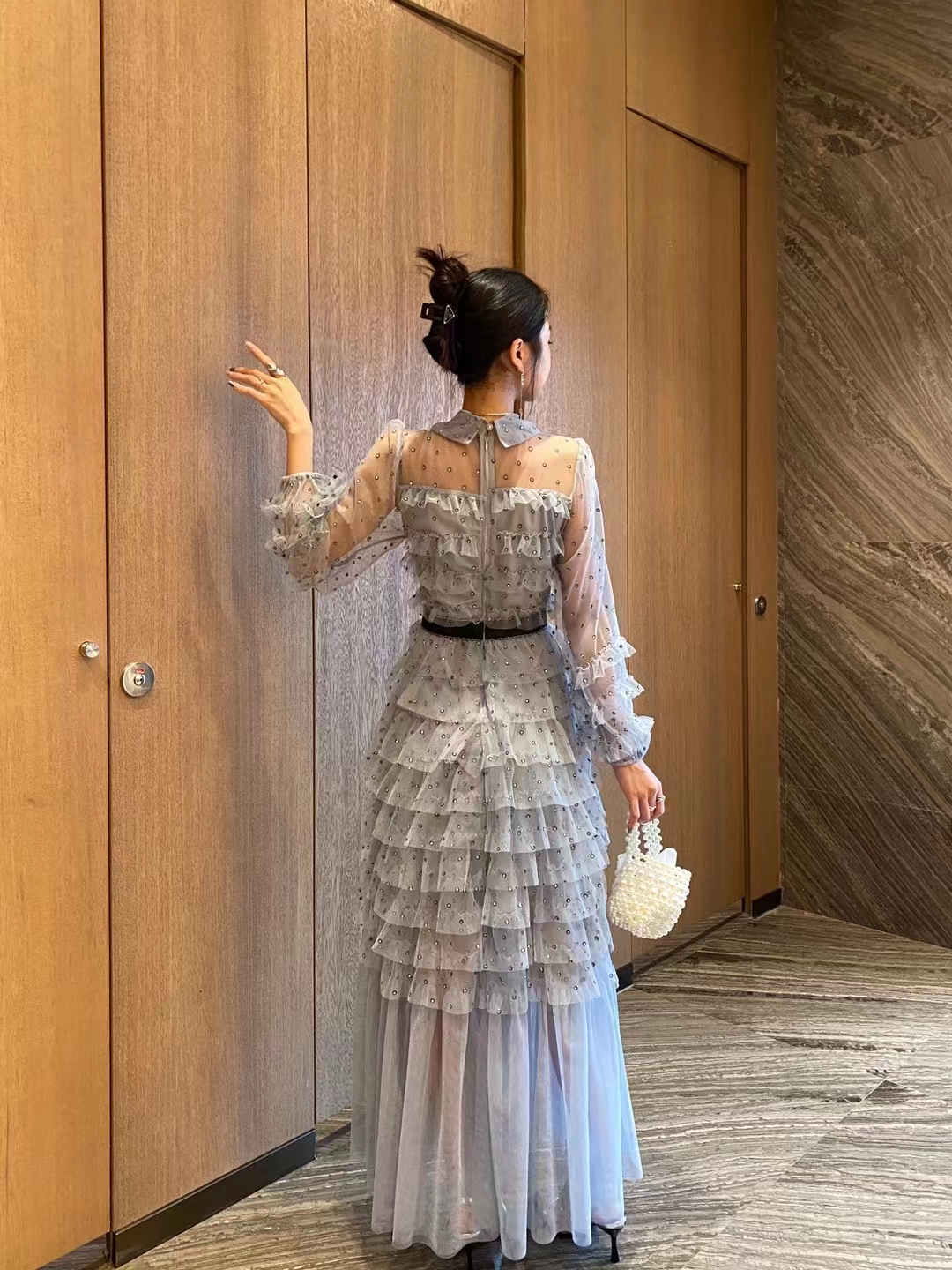小翻领蝴蝶结透视长袖2023秋女装复古网纱波点层层蛋糕木耳连衣裙