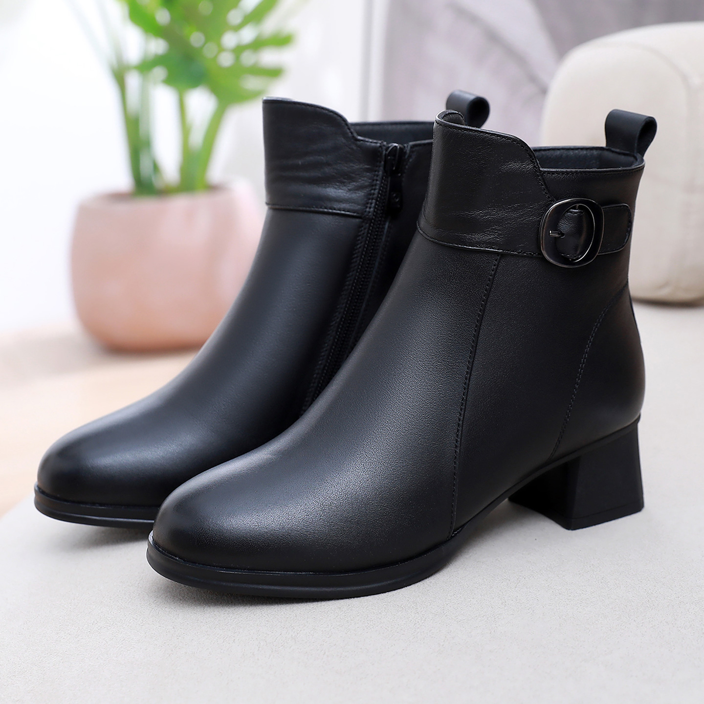 真皮靴子女秋冬季新款粗跟短靴中跟妈妈鞋女士马丁靴加绒中年皮鞋