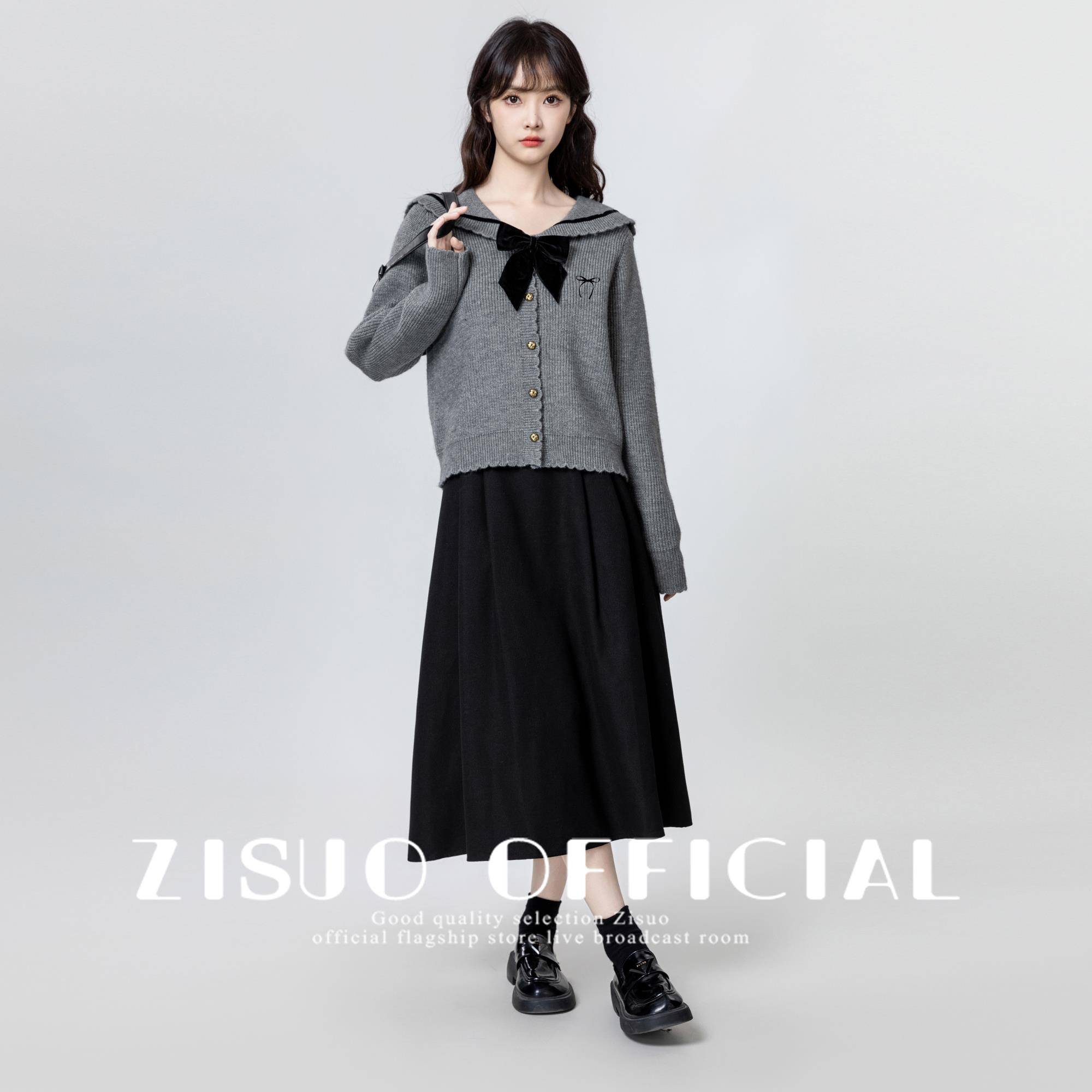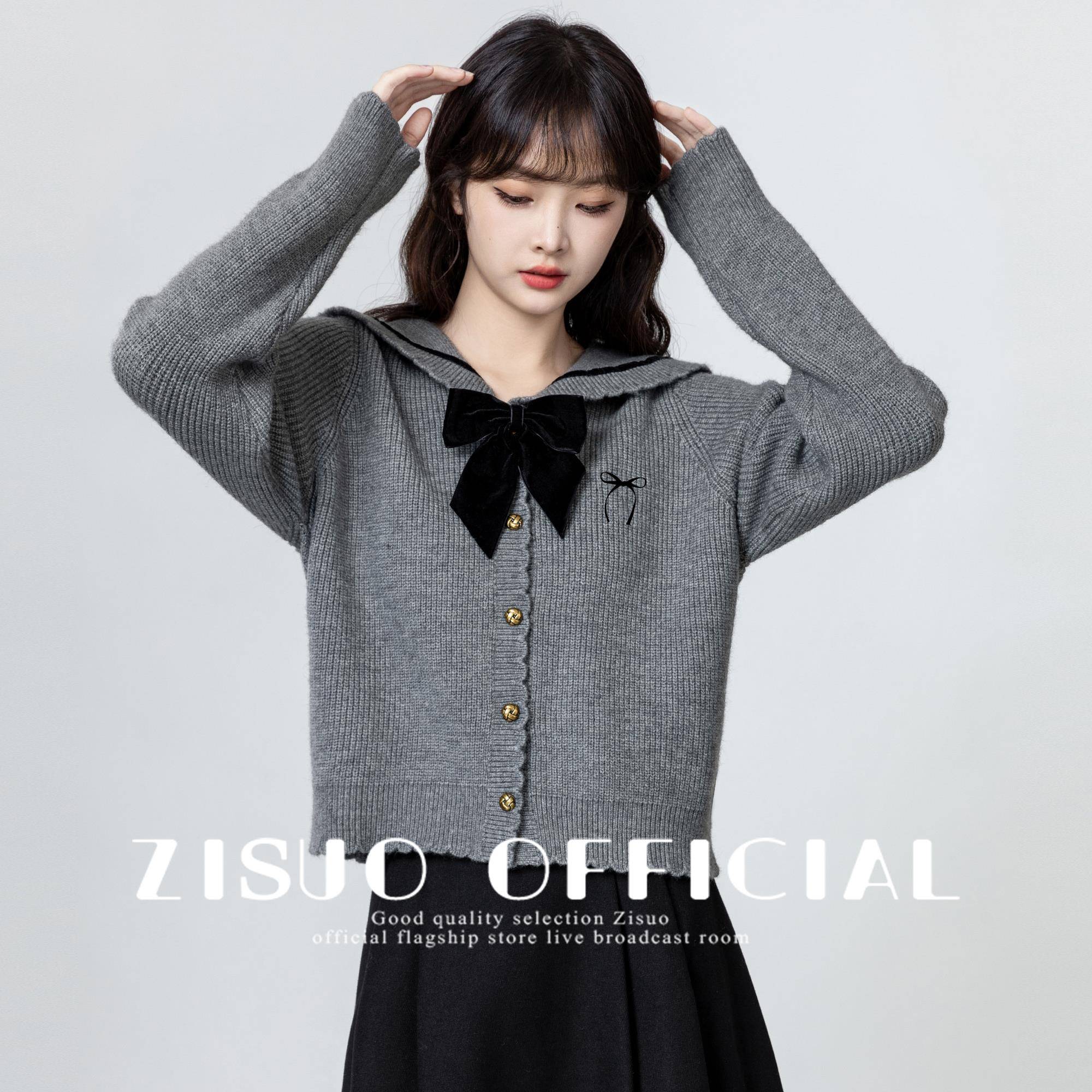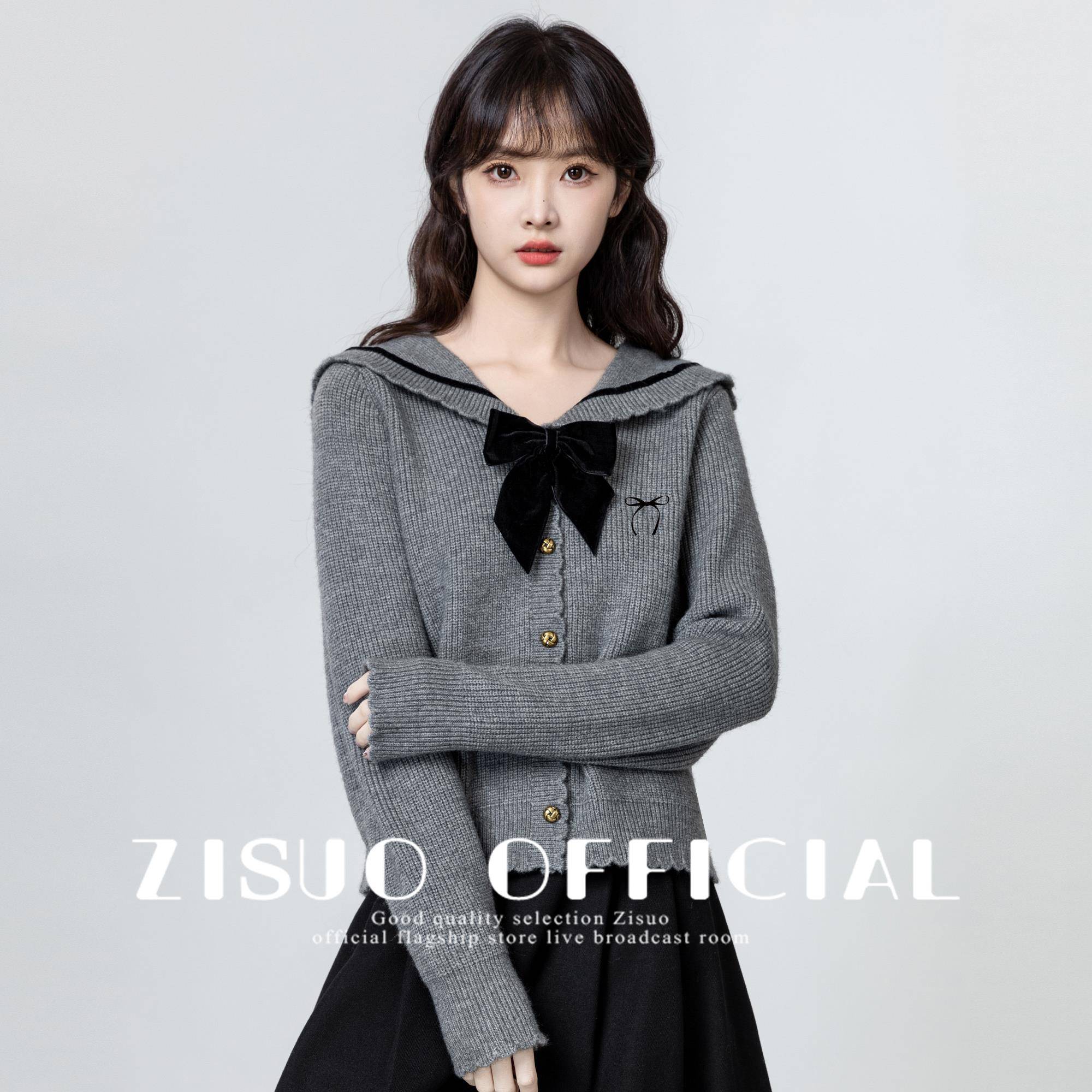 灰色蝴蝶结针织开衫女2025春秋新款学院风海军领毛衣外套短款上衣