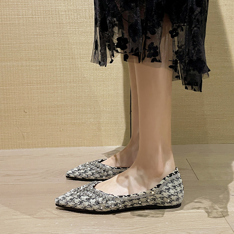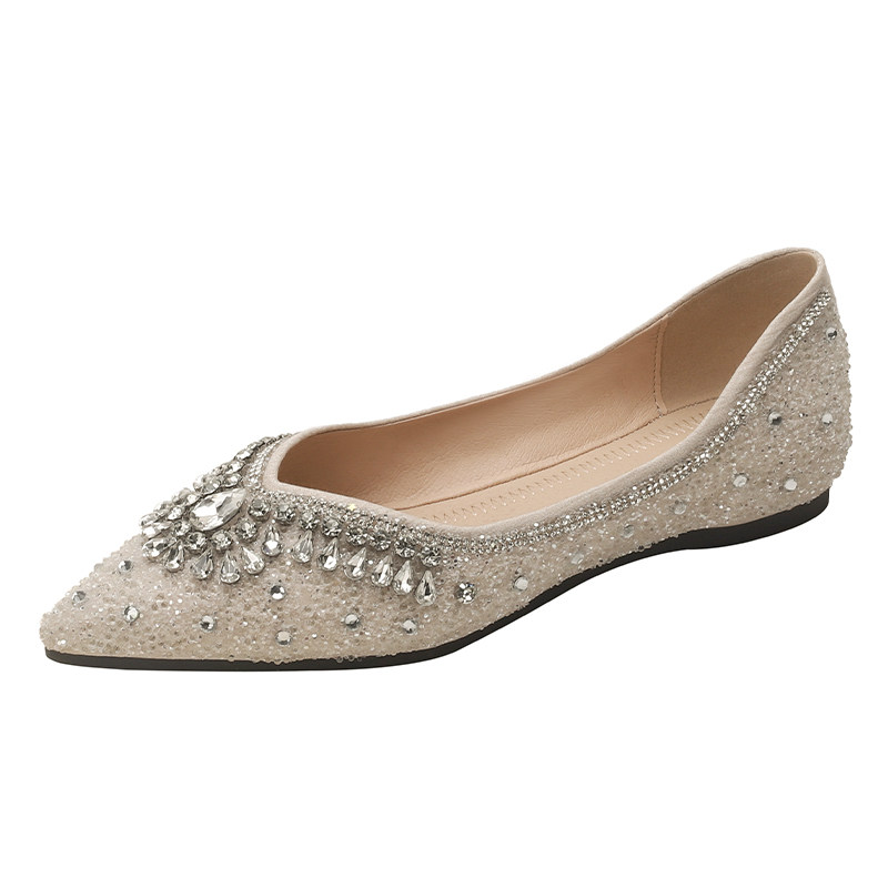 法式气质尖头单鞋女春季平底水钻瓢鞋配裙子晚晚鞋大码女鞋41到43