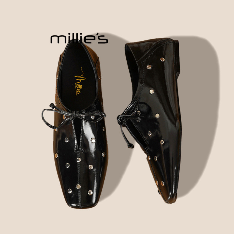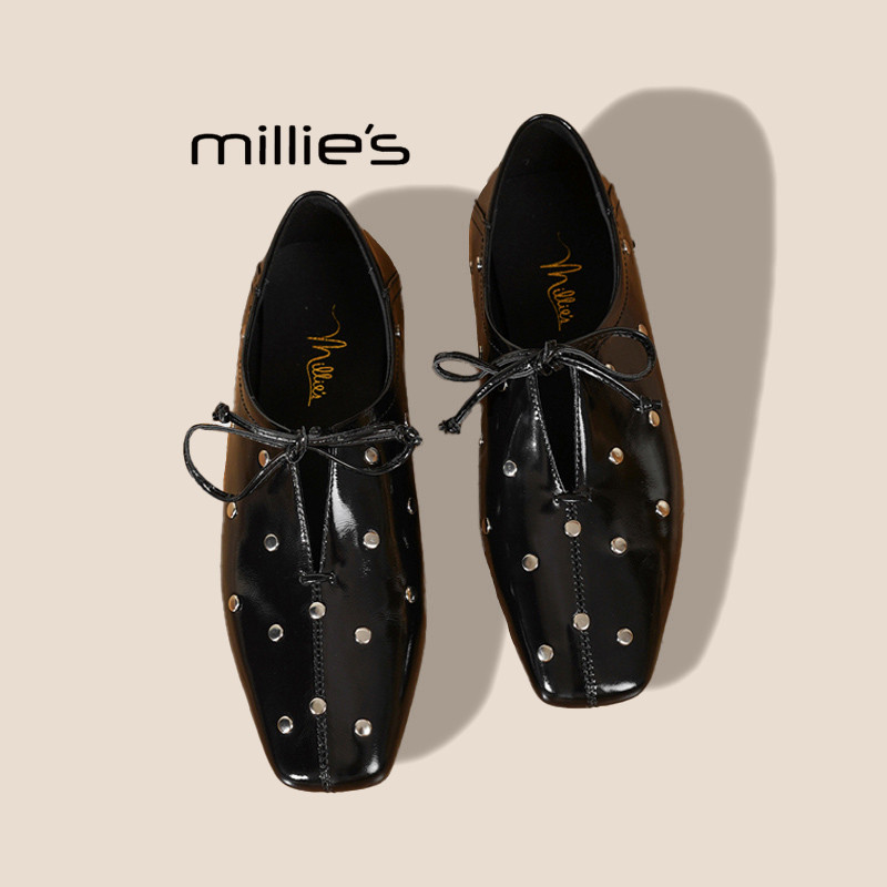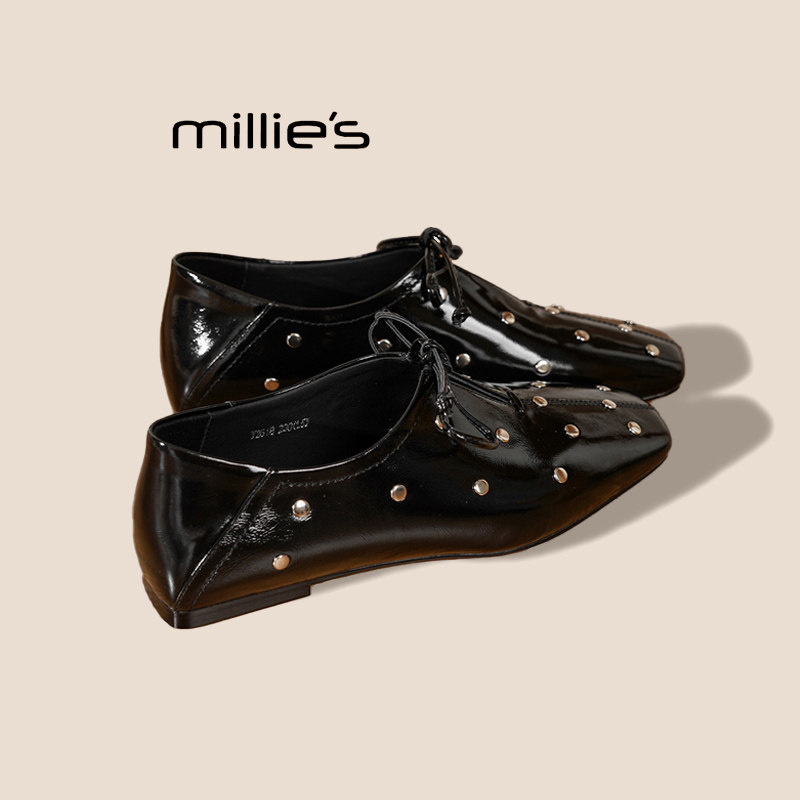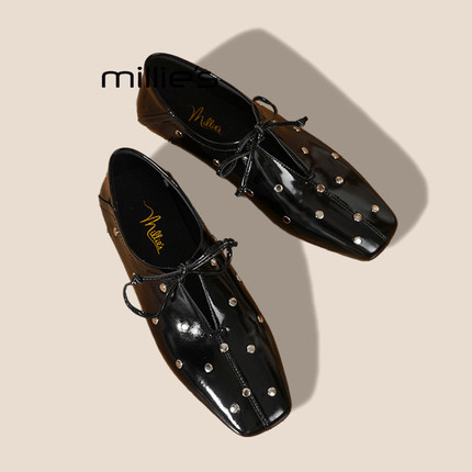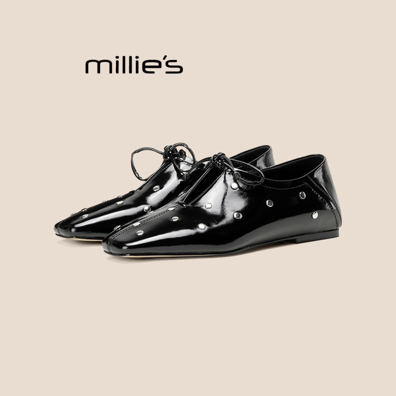 MILLIE'S/妙丽法式方头平底铆钉休闲小皮鞋系带英伦风百搭单鞋女Q