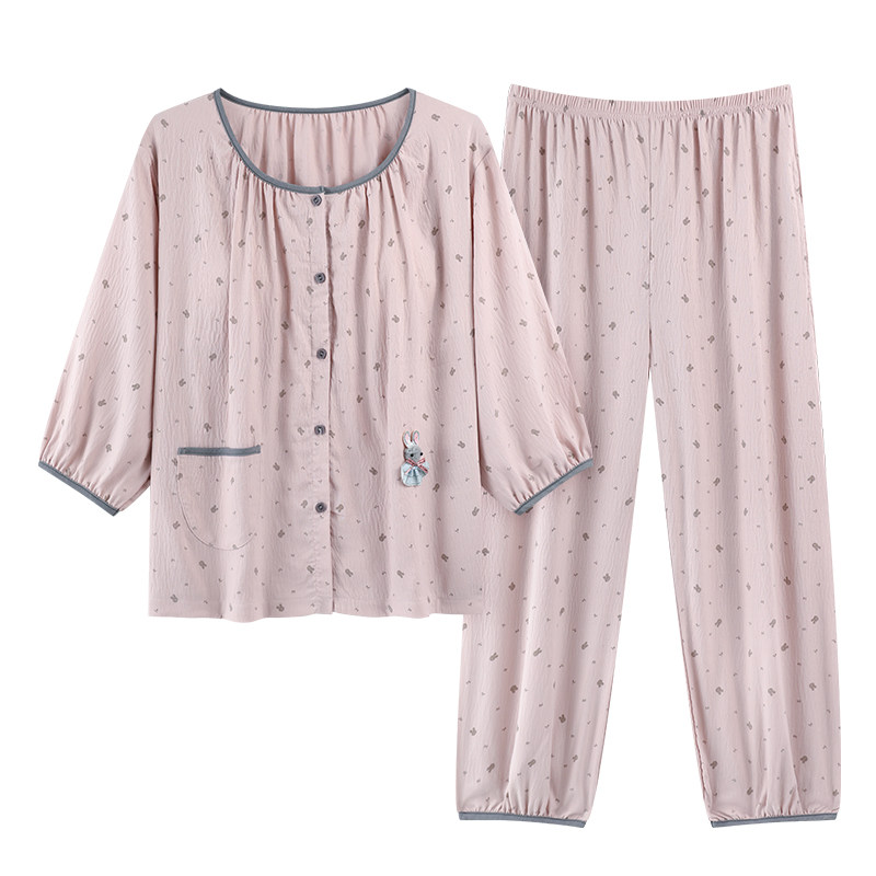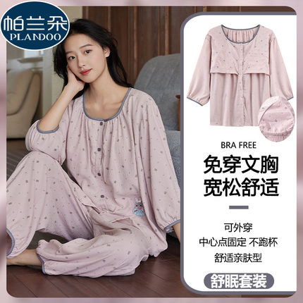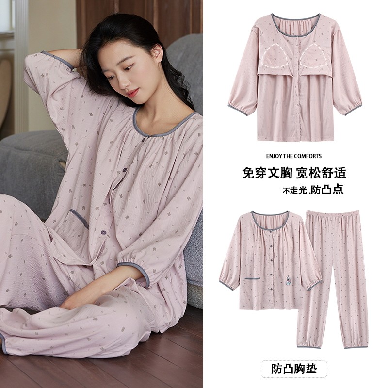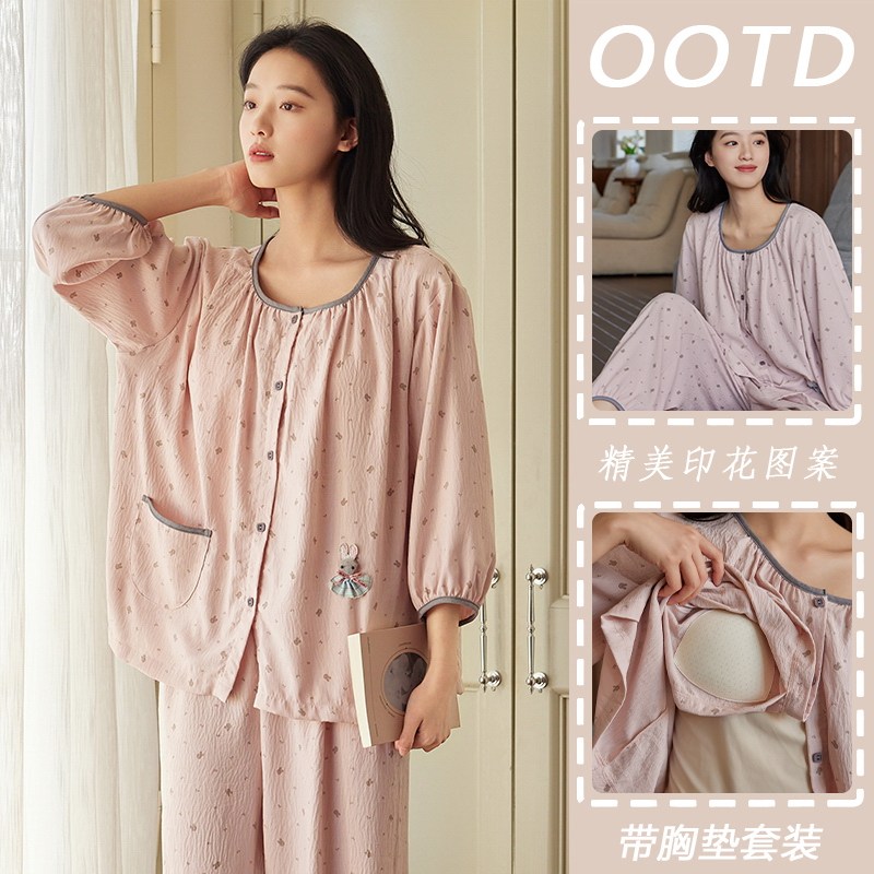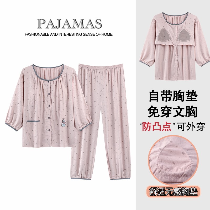 带胸垫纯棉睡衣女春夏季可爱甜美公主风大码圆领开衫七分袖家居服