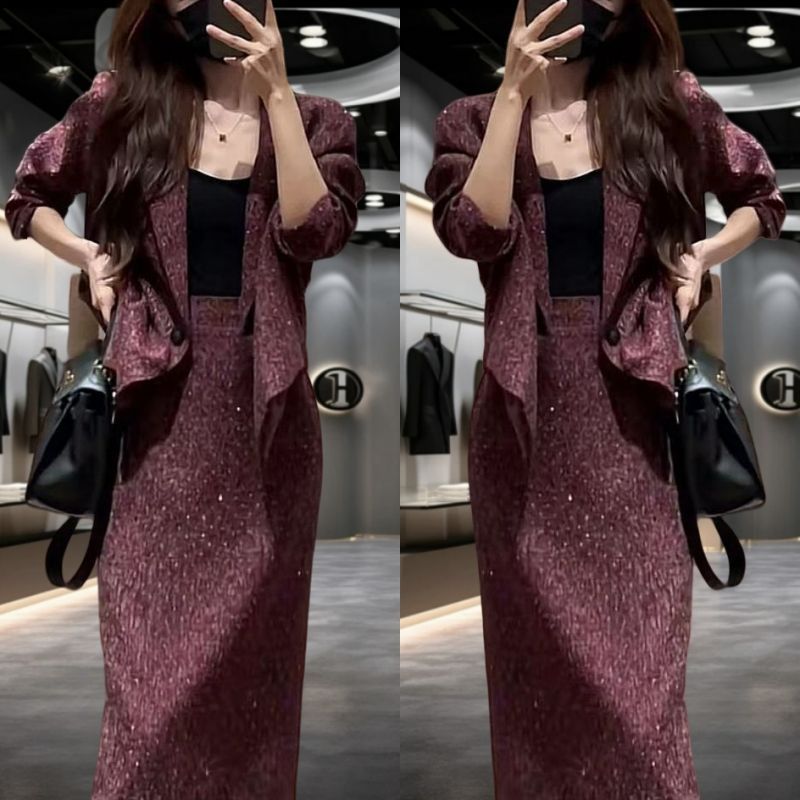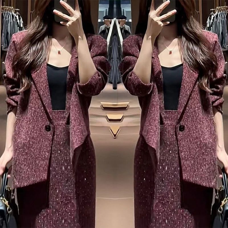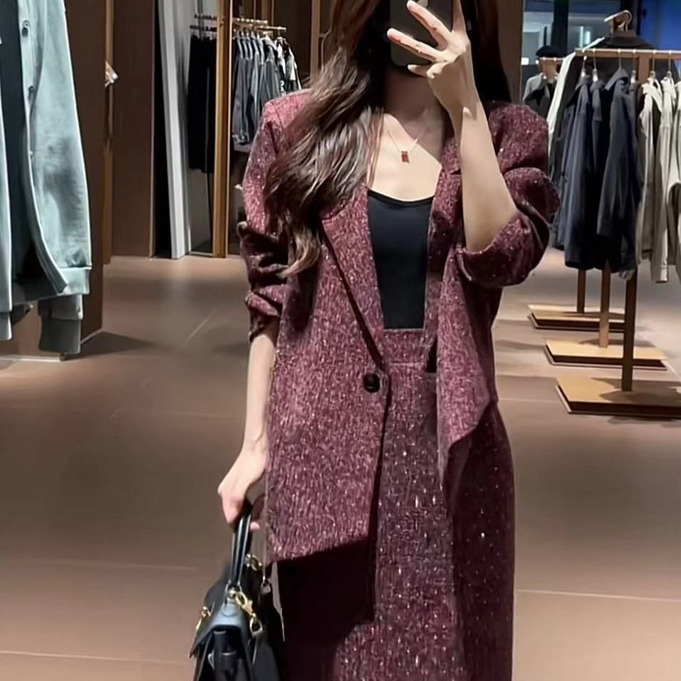 轻奢高端春秋新时尚显瘦满天星西装外套开叉修身百搭半身裙套装女