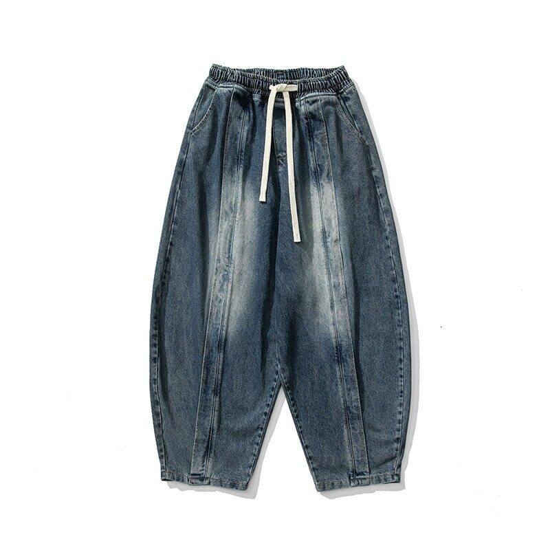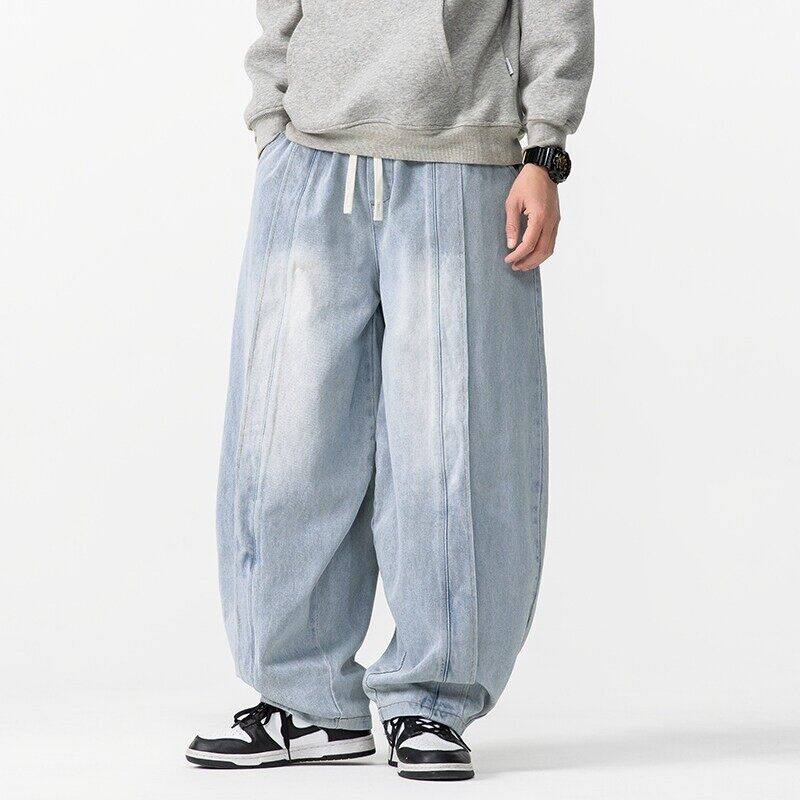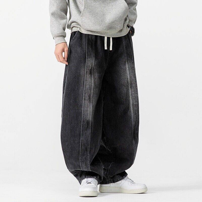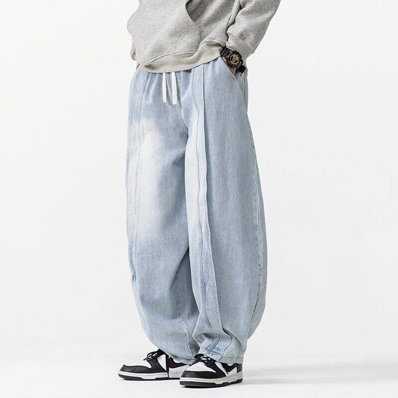 日系复古弯刀牛仔裤男宽松直筒大码阔腿裤青年休闲哈伦裤子潮长裤