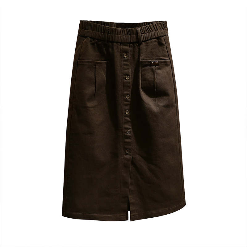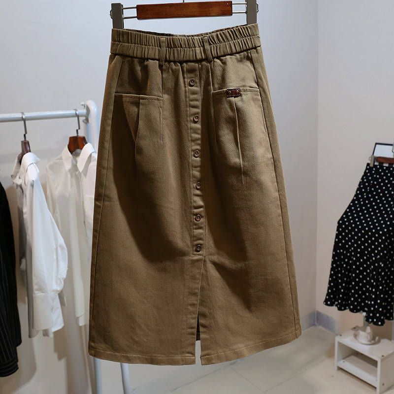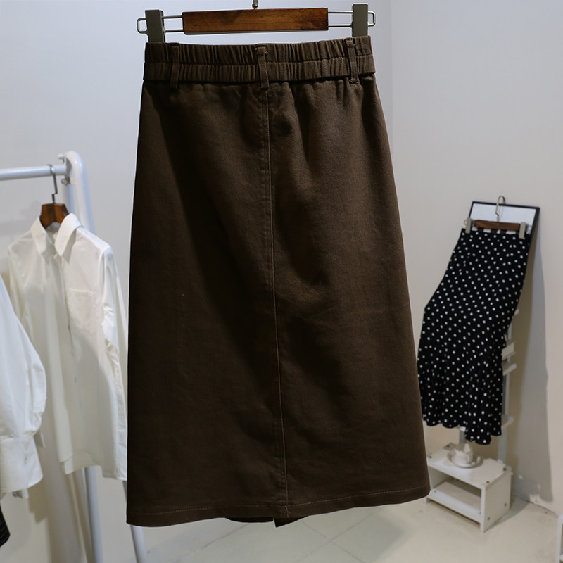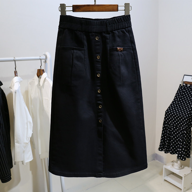 松紧腰弹力中长款牛仔半身裙2025春秋新款显瘦排扣开叉包臀A字裙