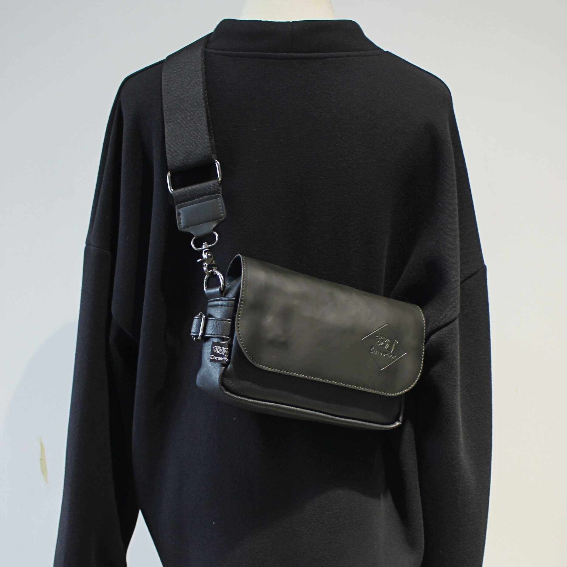 ThreeBox日系潮牌翻盖小挎包皮质单肩背包男生手机包休闲小斜挎包